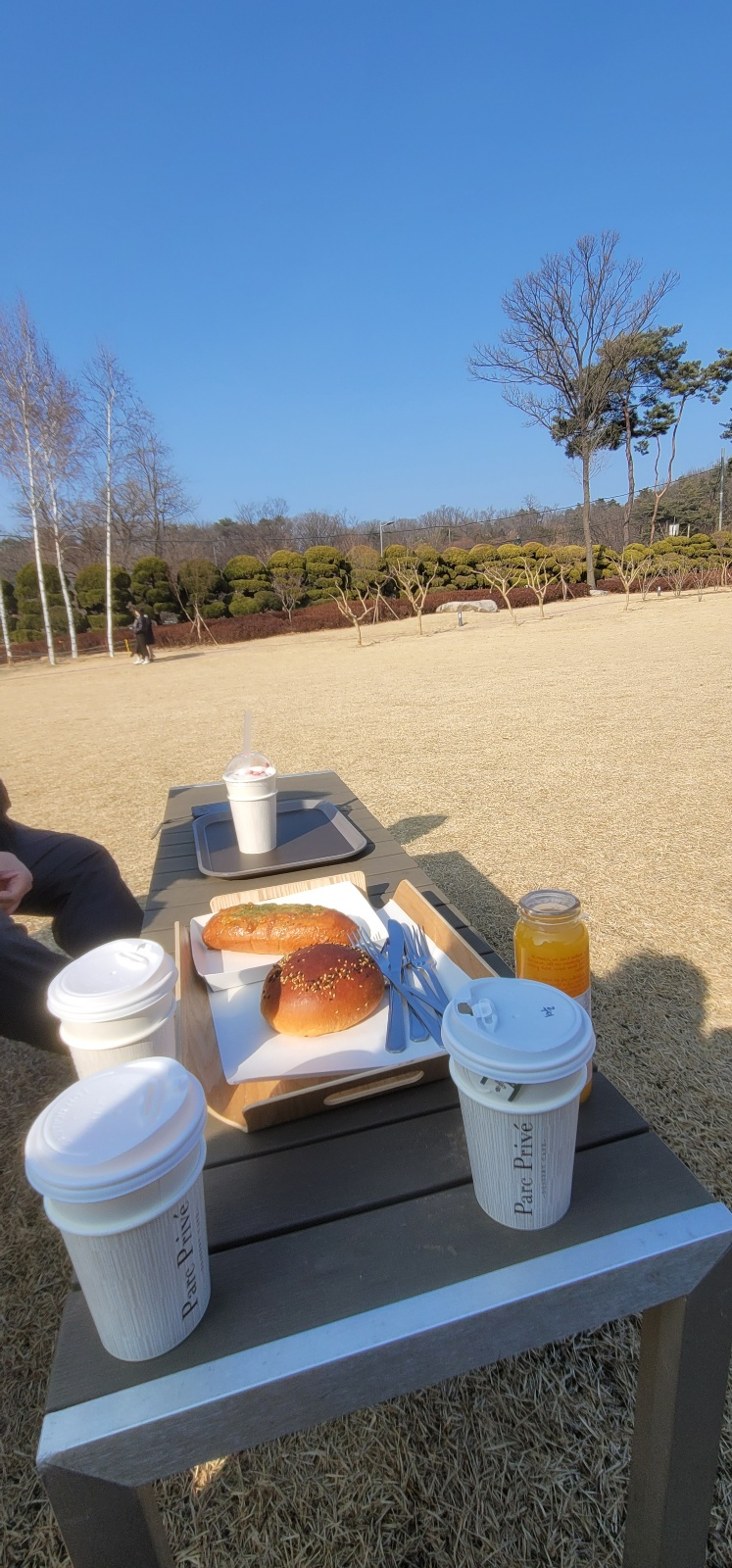 여기서 빵을 안먹기에 아쉬워서 주문했습니다. 빵이 먹음직스러워서 구매했고 아이들이 먹기 좋은 과일 주스도 판매하고 있었어요. 주스가 9,000원이라 가격대는 좀 놀랐지만 아이용 누디 주스는 가격이 4,000원으로 먹이기 괜찮았습니다. 레스토랑을 이용 안 하실 것 같이 라면 주변에서 점심을 든든히 먹고 1층 야외카페에서 아이와 함께 뛰어놀고 간단히 마시는 것도 좋은 코스라고 생각됩니다. 앉아서 바로본 풍경은 저 멀리 산이 보이고 새들도 있어서 아이가 신나게 뛰어놀 수 있었습니다. 우리 아이는 나무에 물을 준다고 자꾸 그래서 물통에 물을 채워서 물을 주고 다녔습니다. 이 날이 설이었는데도 오픈을 하였는데 사람들이 많이 와서 설 때 가족들과 갈 곳이 마땅하지 않다면 이곳으로 오는 것도 추천합니다.