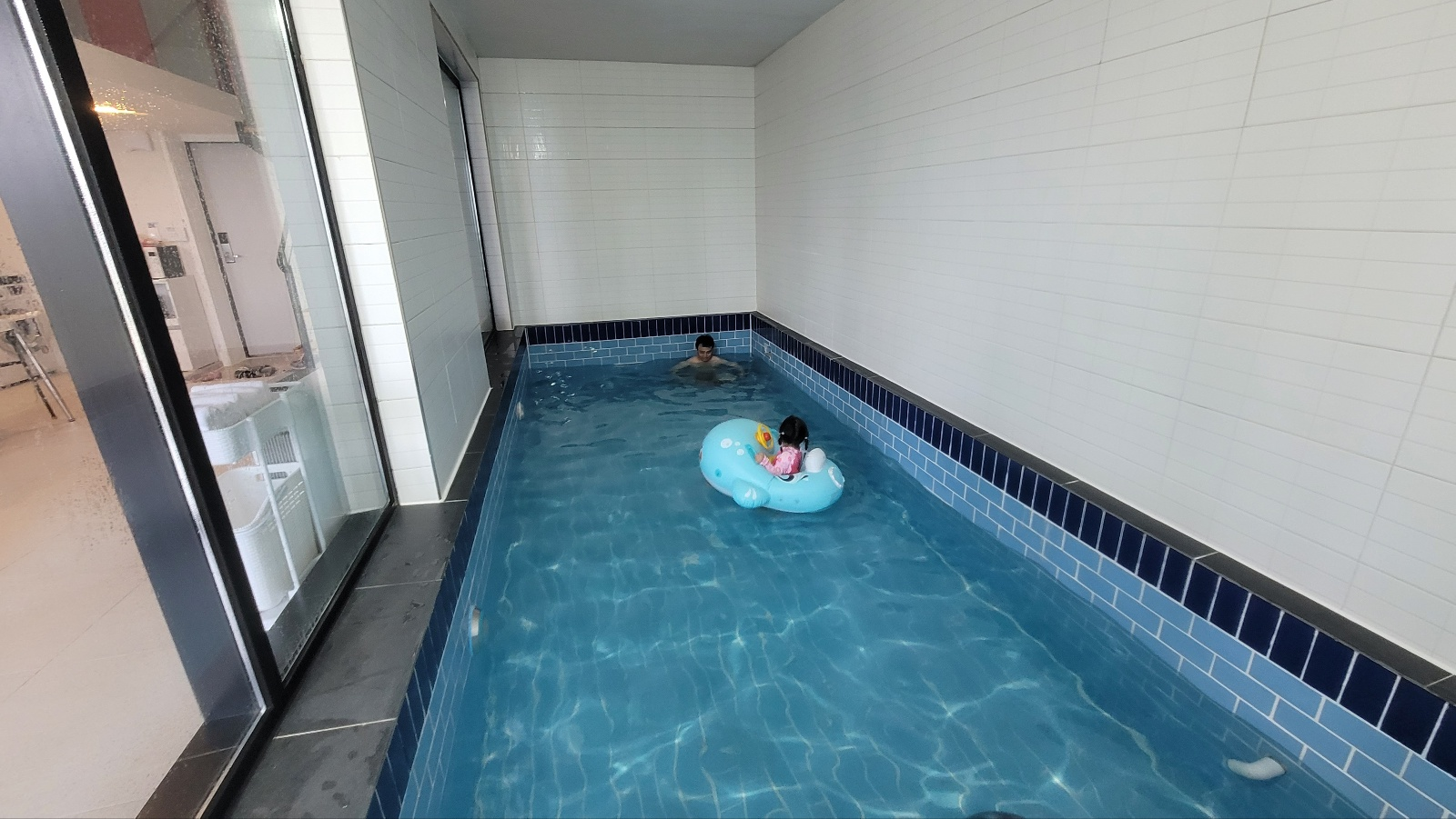 숙소 이용전에 온수풀을 사용할지 정해주셔야하는데요. 아이와 들어가기 위해서는 추가비용을 내고 온수풀을 하였습니다. 숙소내에 가족끼리 들어가는 수영장이라 눈치볼 것없이 편안하게 수영복으로 갈아입고 나왔습니다. 튜브는 숙소내에 1층에 다양한 튜브와 팔튜브, 구명조끼까지 있어서 선택해서 가져가서 사용할 수 있었습니다. 우리 아이가 튜브 욕심이 많아서 어쩌다보니 튜브를 이것저것 챙겨와서 너무 재미있게 놀았어요. 그때 숙소에 머무르신 분들이 없어서 다행히 아이가 맘껏 가지고 놀았습니다. 굳이 튜브를 챙길 필요가 없어서 짐이 덜었습니다. 생각보다 넓어서 어른들도 수영할 수 있는 크기였습니다. 아빠가 아이에게 인공파도를 만들어주면서 너무 신나게 놀았어요. 아빠도 탈 수 있는 큰 튜브가 마련되어있었습니다. 아이가 발이 닿는 높이여서 아이가 튜브를 안하고 직접 물속을 걸어다니면서 수영하고 잘 놀았습니다. 물놀이 후에는 슬슬 배가 고파지네요. 저녁먹을 준비를 하러 고고우~