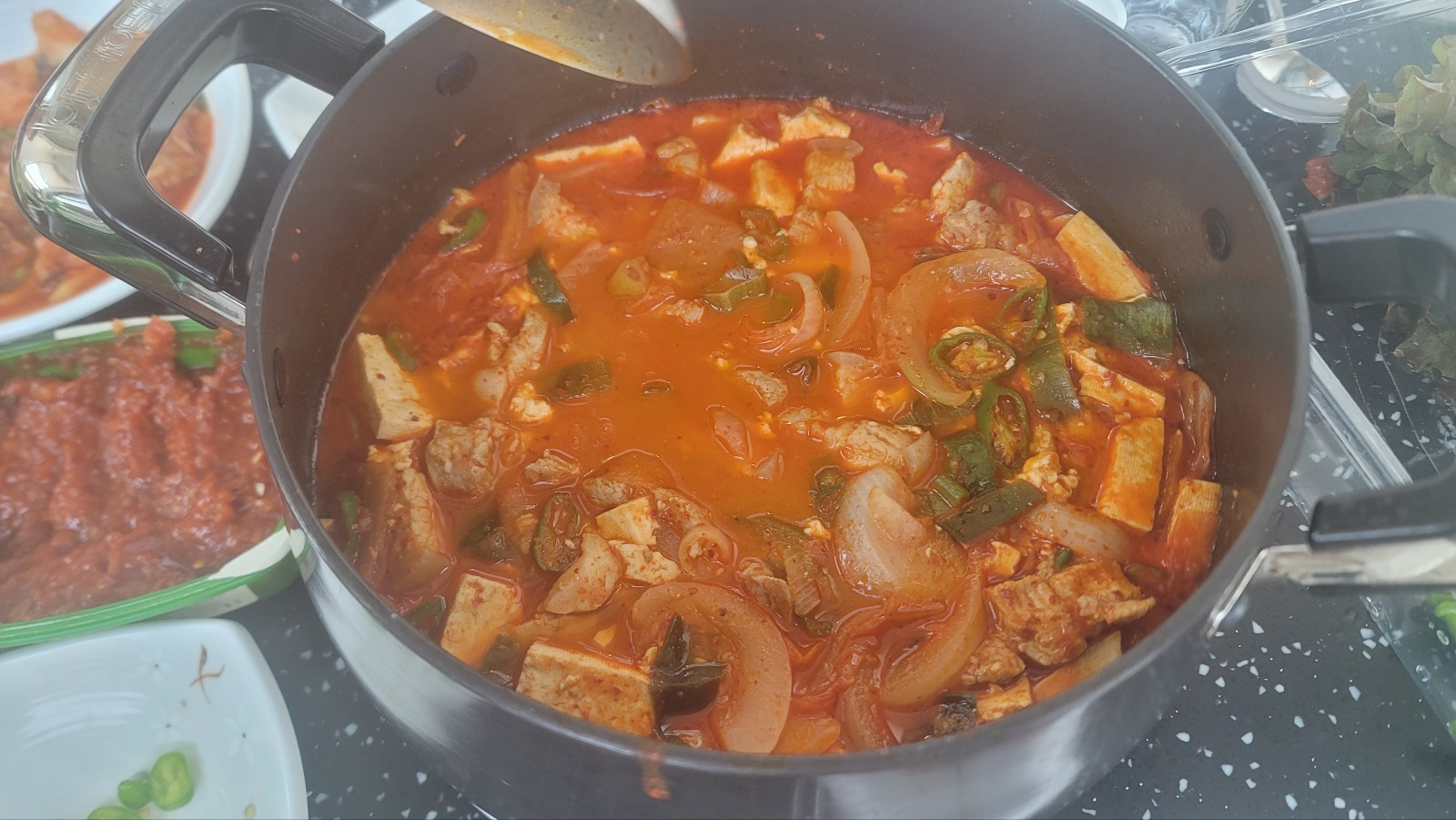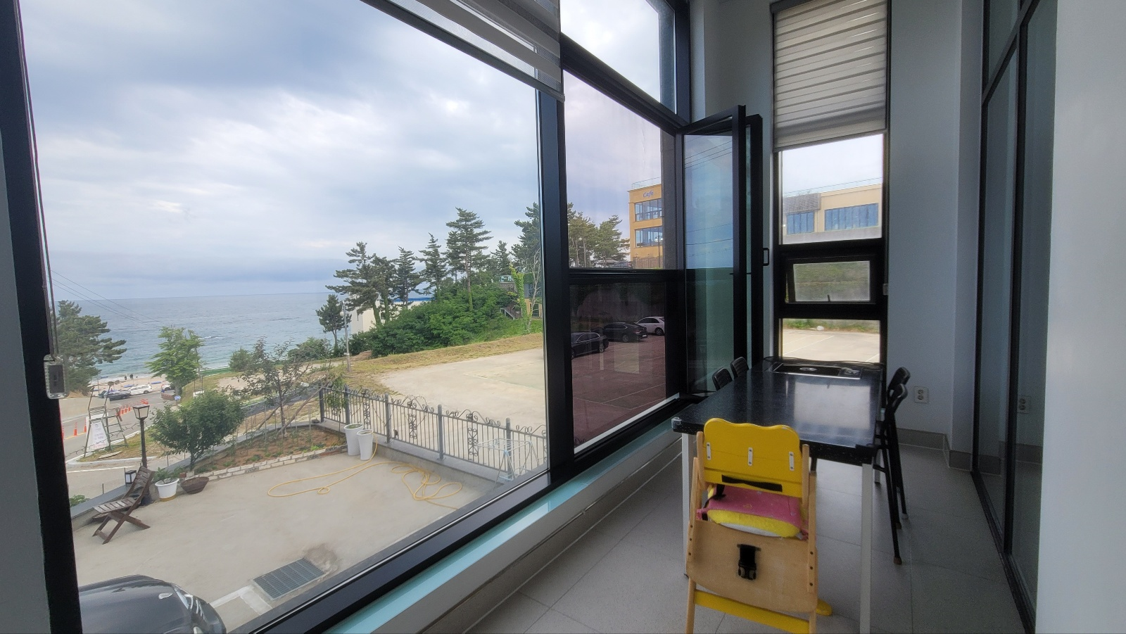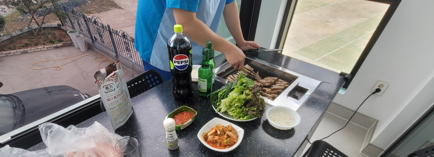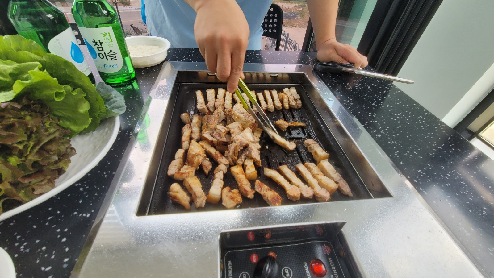 미리 숙소를 들어가기전 마트에서 장을 봐와서 냉장고에 넣어놓은 삼겹살과 쌈야채, 그리고 시원하게 마실 소주까지 완벽하네요. 아이도 같이 먹기위해 햇반도 사고 매콤하게 먹을 김치찌개 팩으로 나온 것도 구매했습니다. 이것저것 먹을 거리를 사서 오길 잘한것같네요. 하루는 푹 숙소에서 아이와 놀고 먹고 자고 편하게 보낼 수 있는 코스였습니다. 바베큐는 추가비용을 내고 사용할 수 있었습니다. 부엌과 분리된 배란다에서 고기를 구워먹어서 냄새도 확실히 잘 빠지고 내부공간을 공기가 청정해서 참 좋았습니다. 남편이 나중에는 김치찌개에다가 돼지고기도 넣고 고추도 넣어서 칼칼한 맛의 김치찌개를 잘먹었습니다. 시원한 바다바람이 들어오고 맛있는 삽겹살을 싸먹으며 도란도란 가족과 대화를 하면서 여유롭게 아이를 유리창 너머 뭐하고 있는지 볼 수있어서 좋았습니다. 아이는 밥을 먹고 계단으로 올라가서 키즈카페에서 놀고 침대에서 뛰어놀고 또 스마트폰을 보기도하면서 저녁시간이 지나갔습니다.