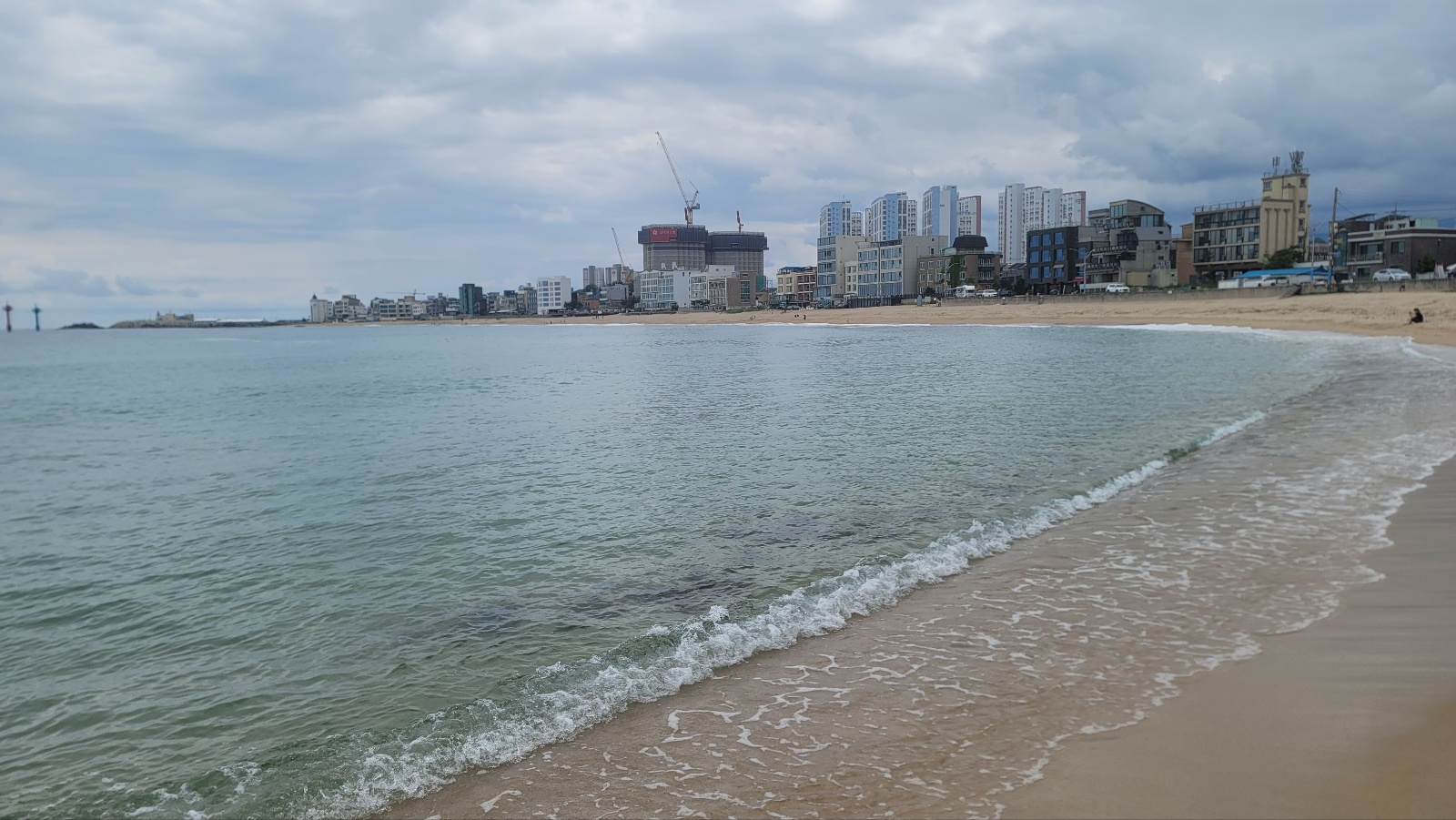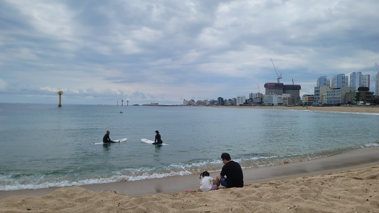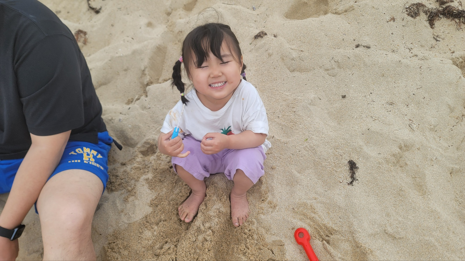 어제 밤바다에서 아쉬웠던 바다의 모습을 볼 수 있었습니다. 부강옥 바로 앞에 천진해수욕장이 있었습니다. 주차를 그대로 부강옥에 두고 아이와 함께 모래놀이 장난감을 챙겨서 바다로 이동했습니다. 따로 돗자리를 챙겨가서 편하게 앉아서 바다를 감상하면서 여유로운 시간을 보냈습니다. 아이가 모래놀이를 하면 거의 1시간정도는 신나게 놀았습니다.