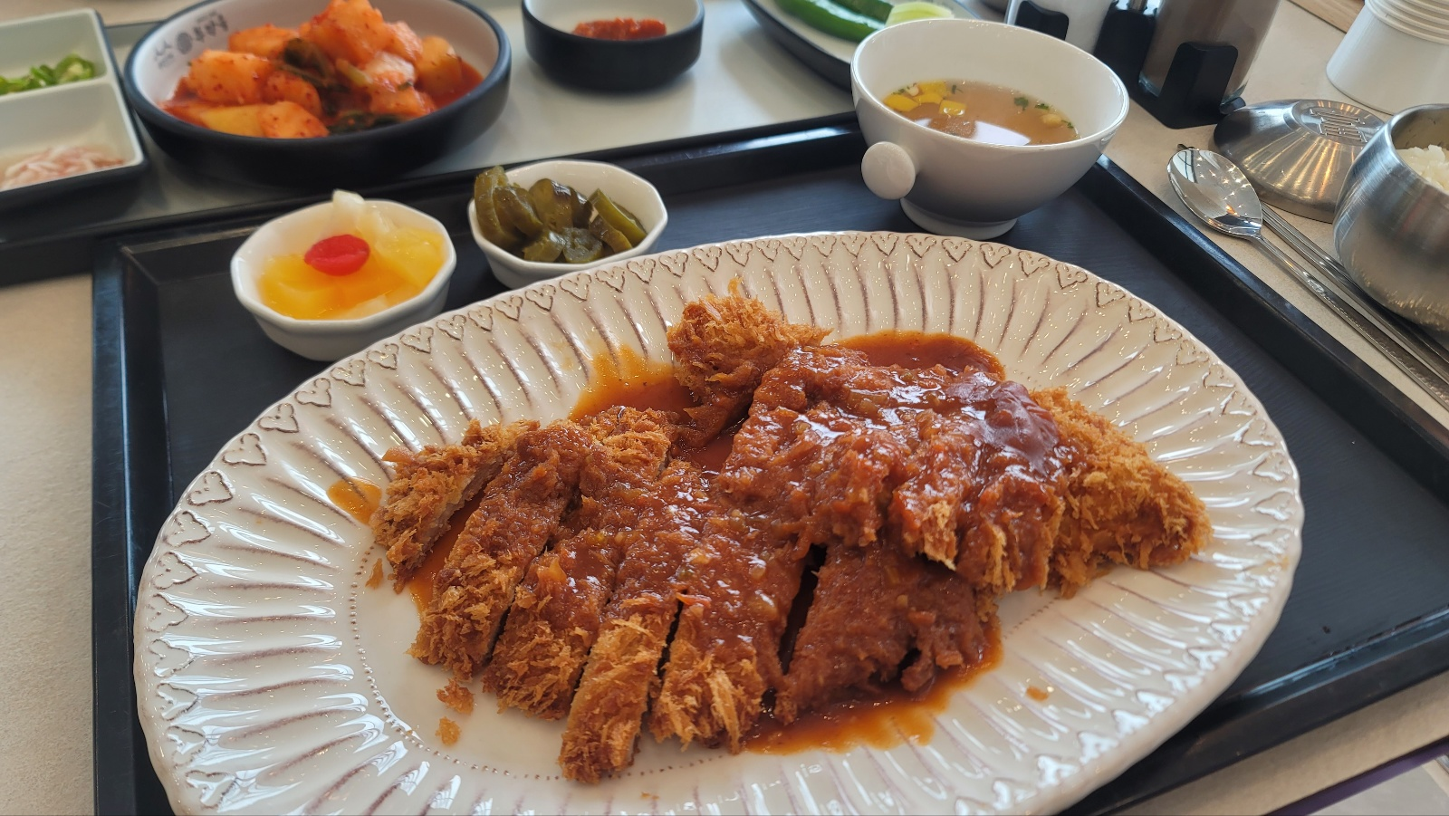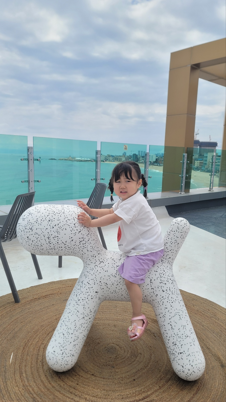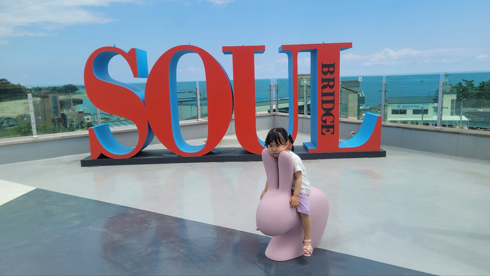 사실 근처에 맛집이 있어 그곳에서 먹을 생각으로 갔는데, 벌써 대기가 90팀에 대기시간이 3시간이나 된다고 해서 빠른 포기후 밤바다가 아쉬워서 낮에서 아이와 모래놀이도 하고 바다에 갈겸 바다 근처에 있는 식당으로 부강옥으로 이동하였습니다. 남편이 순대국밥을 좋아하고 저는 아이와 돈가스를 먹기위해 부강옥에서 아침겸 점심을 먹었습니다. 아이가 돈가스도 잘먹고 순대국물도 잘먹어서 말아서 배부르게 먹었습니다. 시원하게 식혜까지 먹으니 속이 든든하네요. 사실 3층에 위치하는 고성 소울 브릿지 카페도 갈까했는데 배가 불러서 나중을 기약하고 루프탑에서 사진만 찍고 바다로 이동했습니다. 아이가 좋아하는 토끼와 강아지 조형물에도 앉아보고 사진도 찍기 좋았습니다.