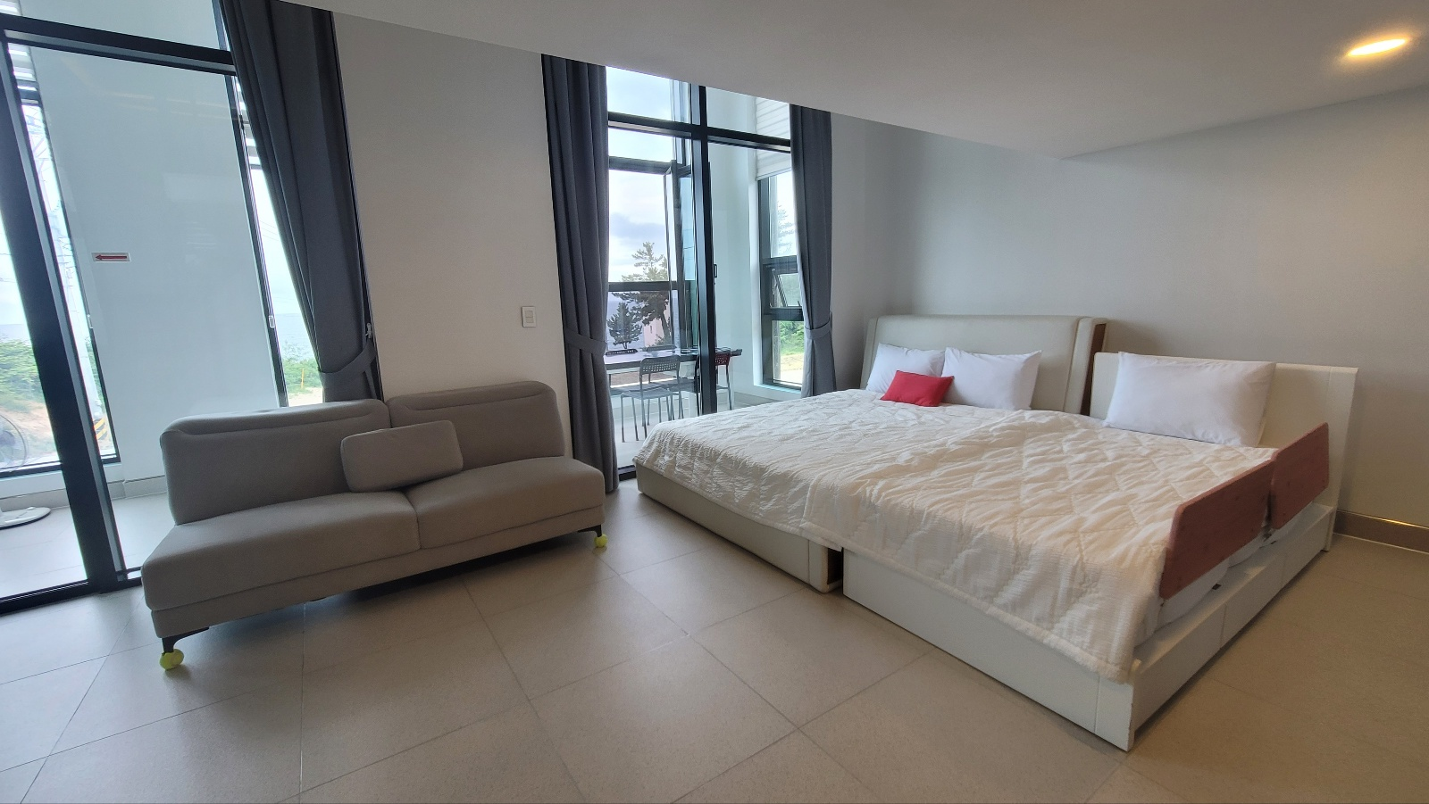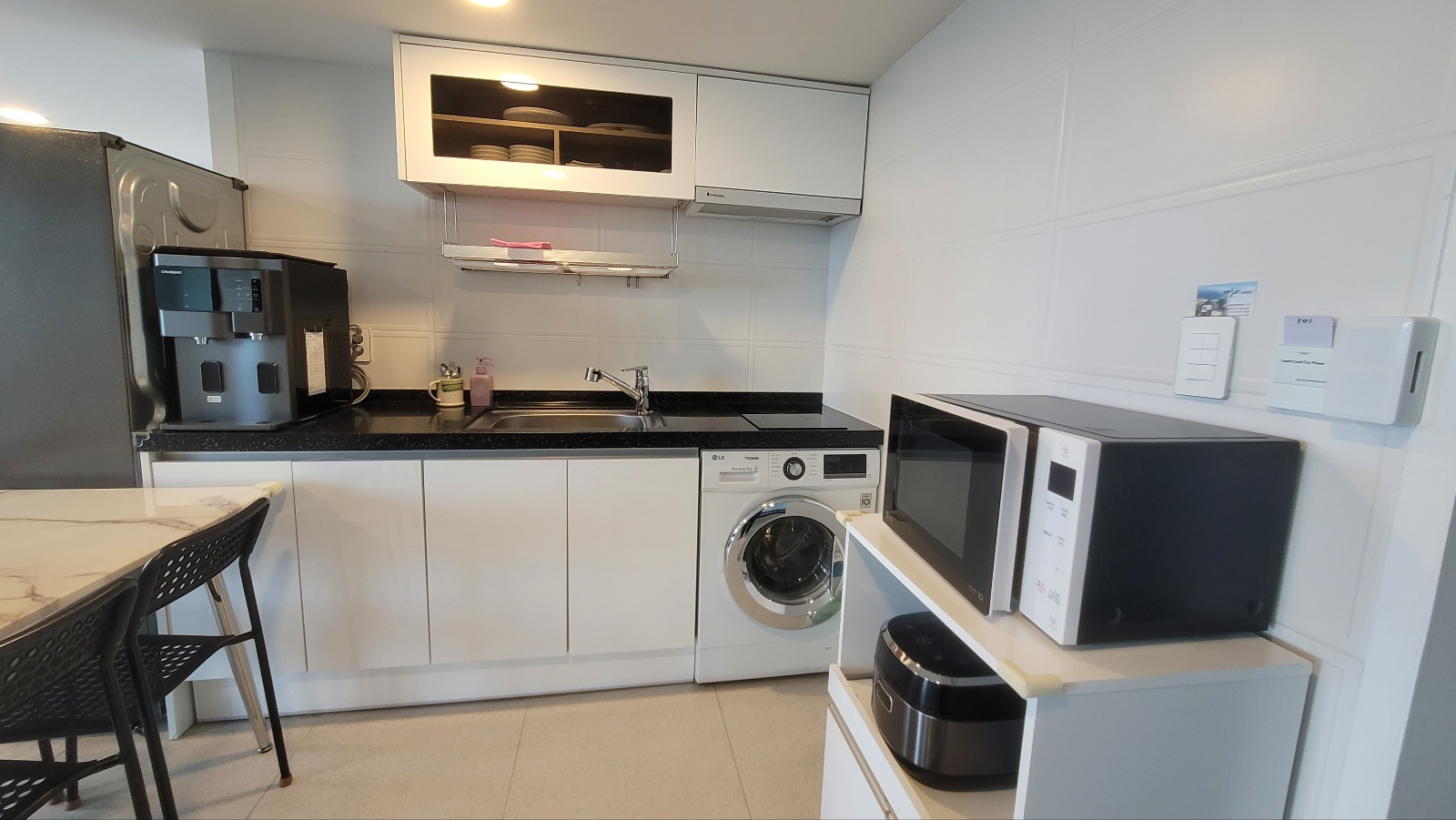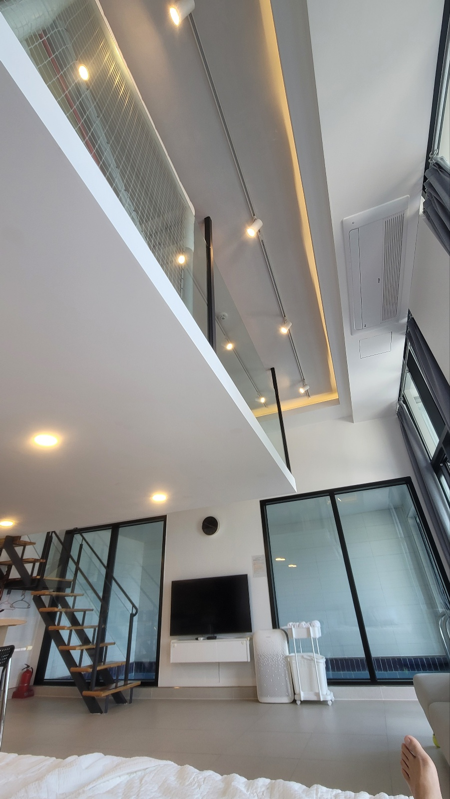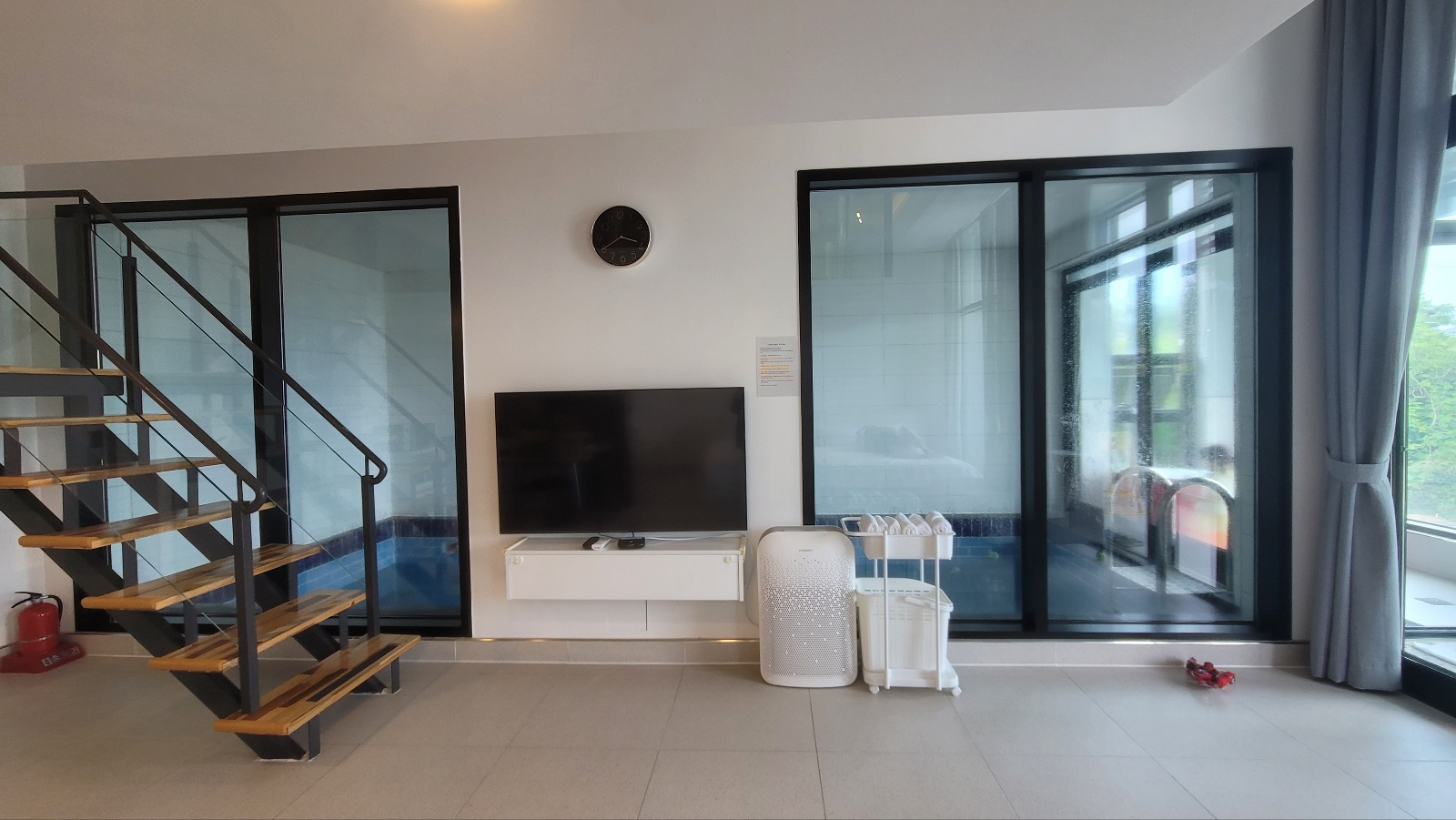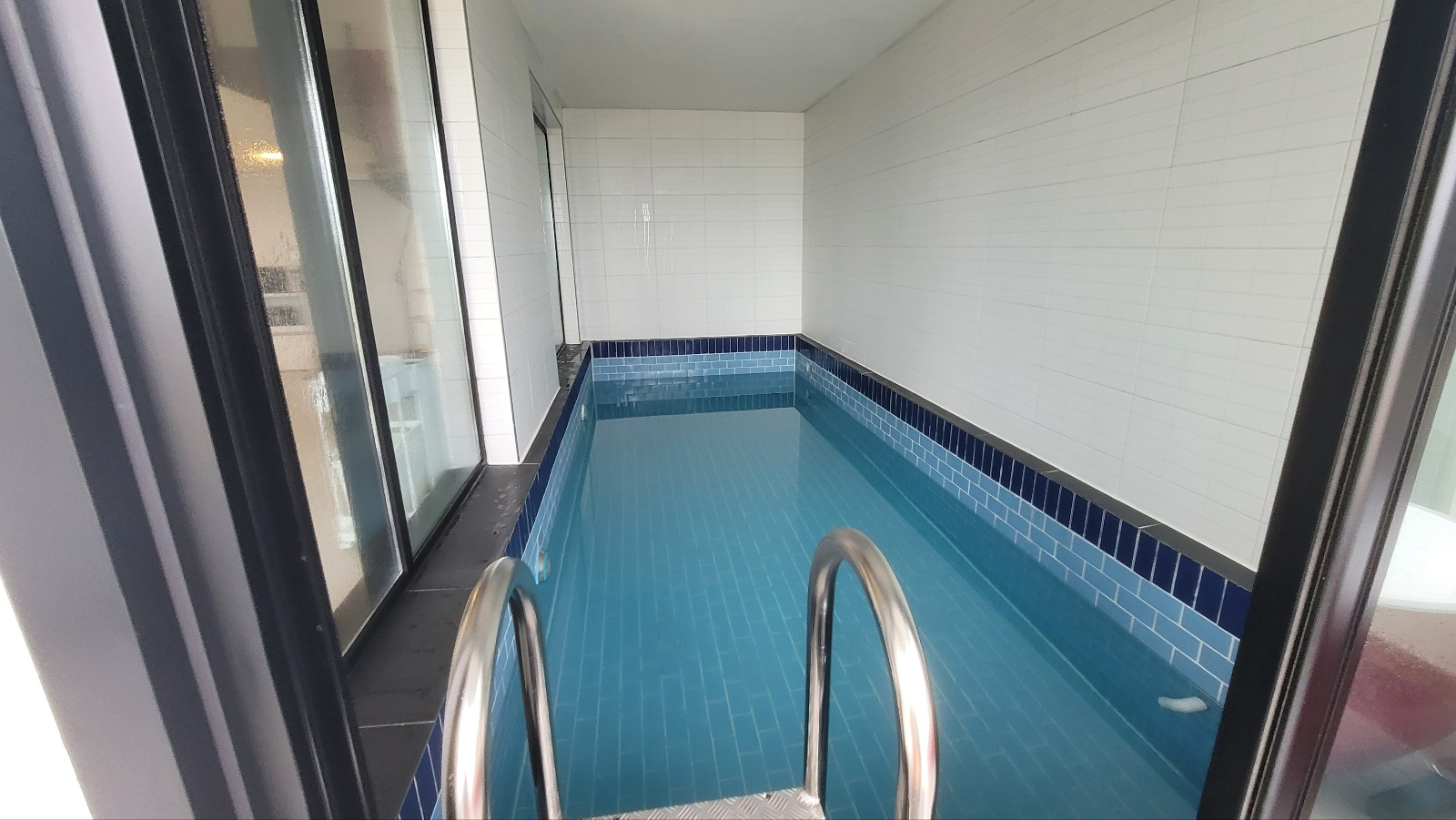 내부는 부엌이 깔끔한 화이트와 블랙으로 정돈되어있었습니다. 그리고 아이와 함께 우리 세명이 함께 누울 수 있는 큰 침대가 있어 편안했습니다. 그리고 소파과 TV가 부엌과 이어져 있었어요. 그리고 침대 바로 옆에는 화장실이 있어 동선이 편했습니다. 침대에서 바라고 미니 수영장도 투명 유리창으로 볼 수 있었어요. 아이가 수영하고 바로 이동해서 화장실로 가기 편하도록 되어있었습니다. 이동시에 1층이라 블라인드나 커튼을 치는 점이 있었습니다. 그래도 1층이라 아이가 뛰어다녀도 눈치 보지않아서 편했습니다. 그리고 공기청정기가 있어 공기정화도 할 수 있었어요.