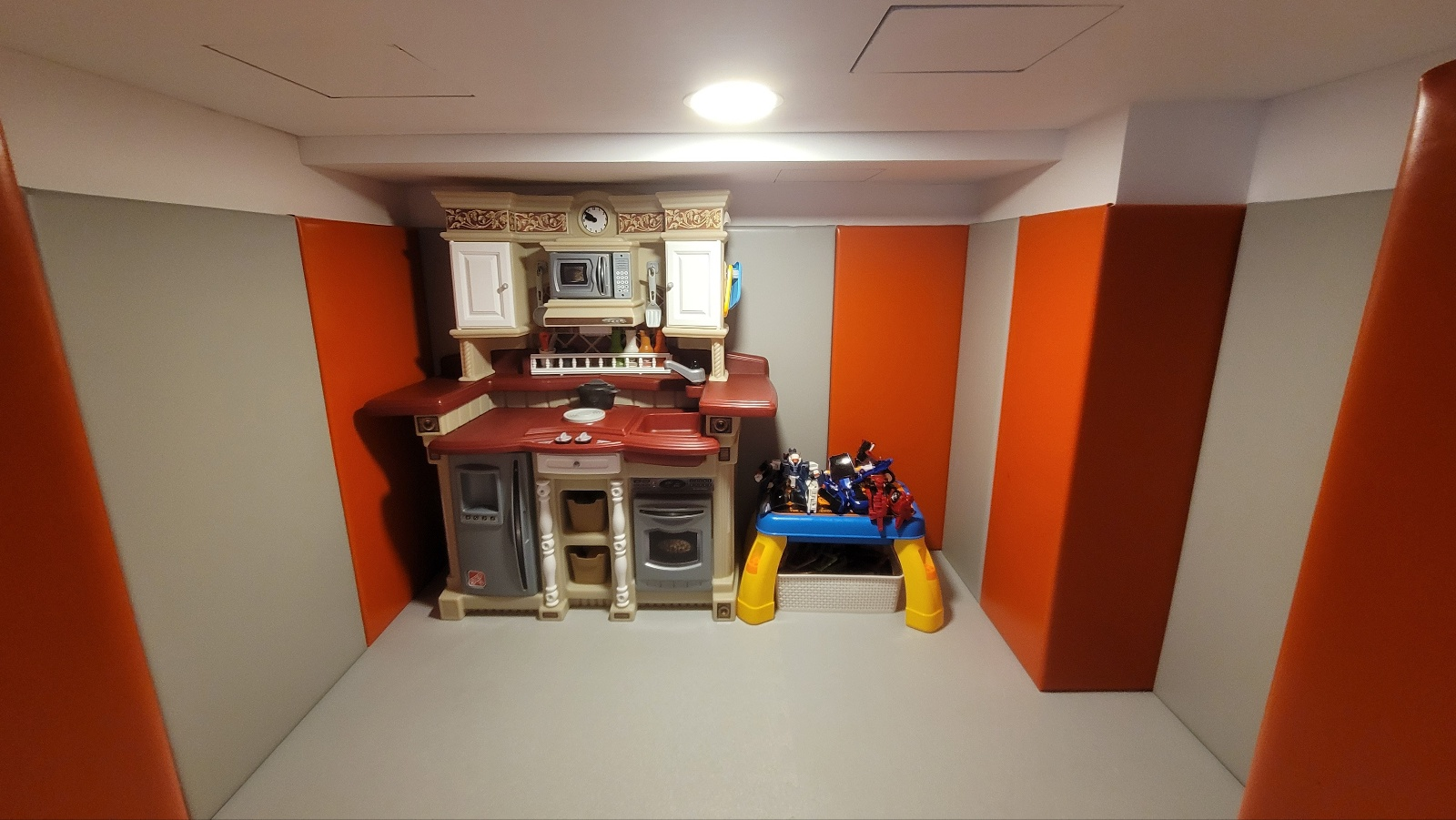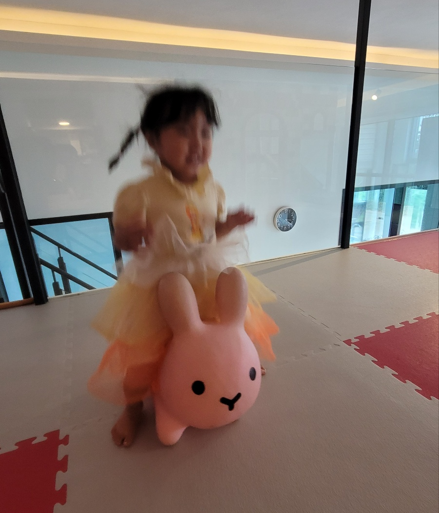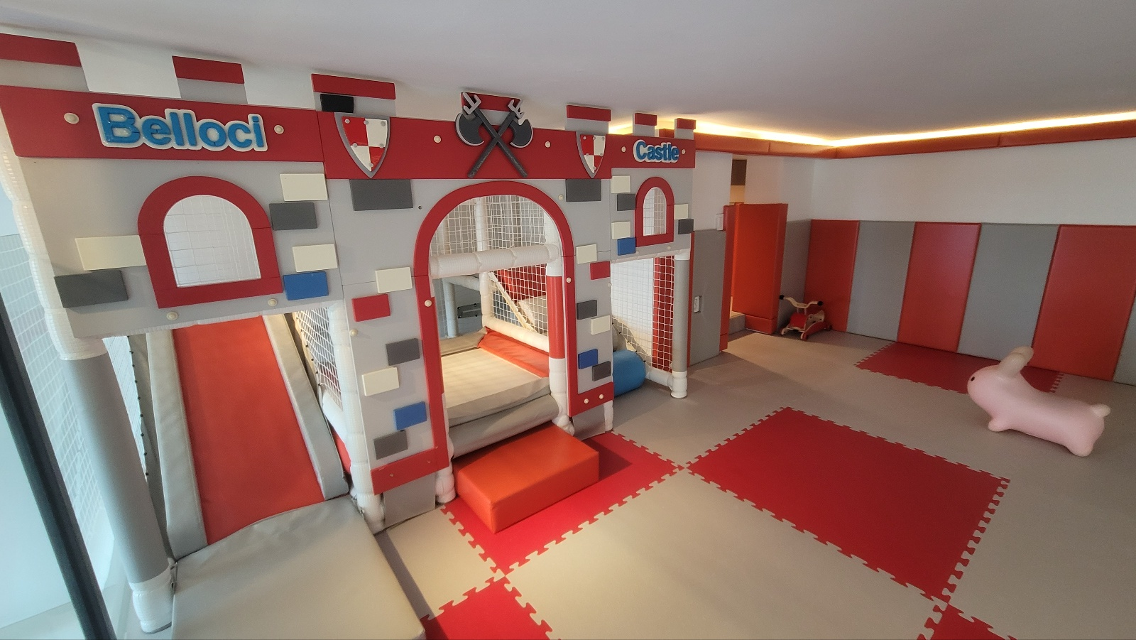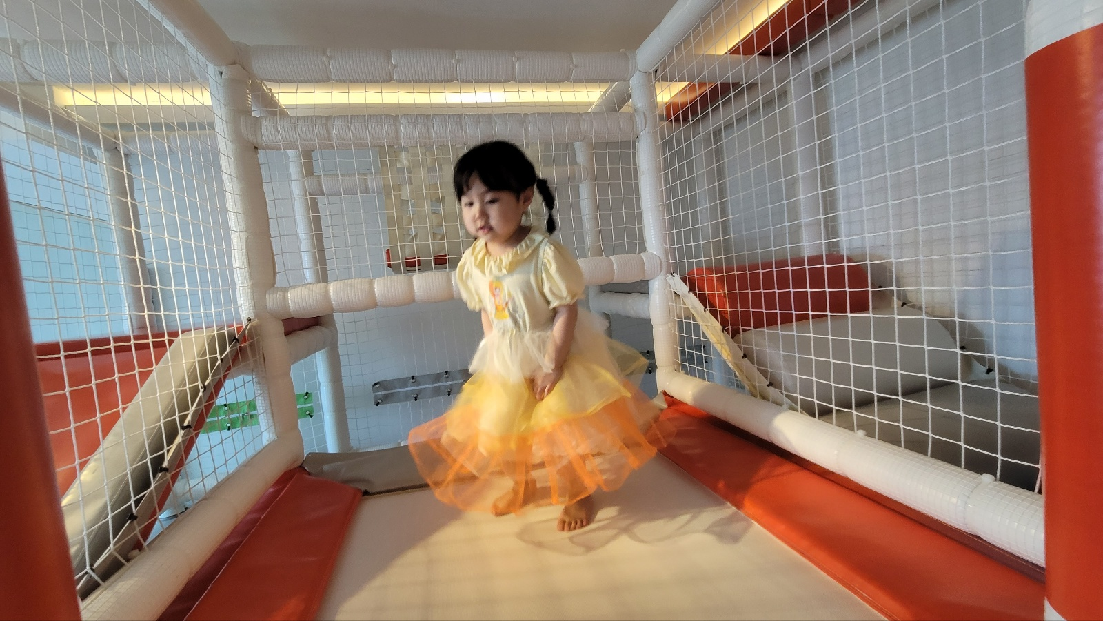 아이가 좋아하는 키즈카페같은 놀이시설이 있는 2층입니다. 우리 아이는 계단을 참 좋아하는데요. 아이가 손잡이를 잡고 올라갔다가 내려갔다가 하나의 놀이처럼 신나게 왔다갔다하면서 놀더라구요. 복층이라 불편할 줄 알았는데, 아이가 좋아했고 천장의 높이가 높아서 시원한 느낌이었습니다. 여자아이들이 좋아할만한 소꿉놀이 장난감도 있고 아이가 방방 뛰어놀 수 있는 퐁퐁이도 있어서 지루할 틈없이 신나게 놀 수 있었습니다. 그리고 변신 로봇이 있었는데 여자아이인데도 가지고 잘 놀았어요. 신나게 키즈카페에서 놀다가 이제 본격적인 물놀이를 하러 미니 수영장으로 이동했습니다.