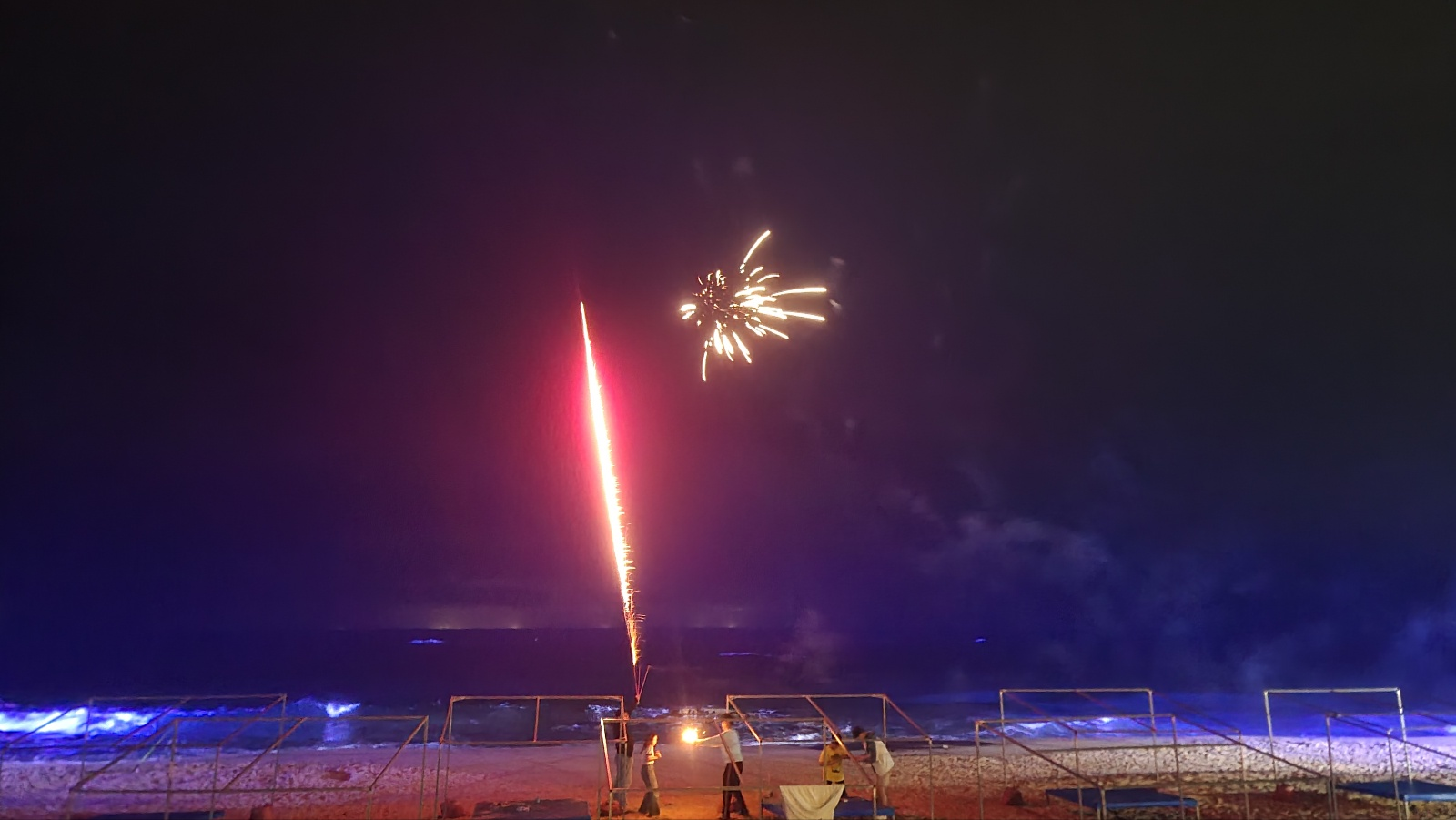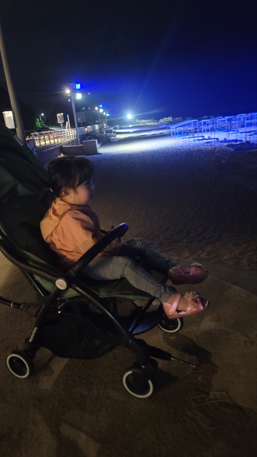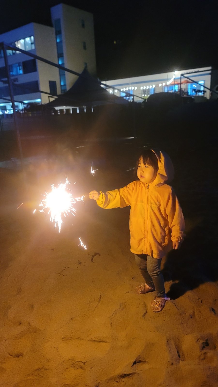 우리아이는 더 놀고 싶은지 잠이 안온다고 하더라구요. 때마침 바깥 하늘을 보니 펑펑 불꽃놀이하는 것이 보이더라구요. 바로앞 아야진해수욕장에서 사람들이 불꽃놀이를 하고 있었어요. 아이를 유모차에 태우고 5분정도 걸으니 바로 앞에 모래사장이 있었어요. 그리고 근처에 CU 편의점이 있어 아빠가 4000원정도 주고 불꽃놀이를 사왔네요. 아이도 신나게 손을 움직이면서 놀았어요. 이미 하늘에 폭죽을 여기저기서 하셔서 구경하느라 바빴기에 아이와는 소소하게 불꽃놀이를 하였습니다. 올라가는 길은 약간 언덕이어서 조금 힘들었지만 그래도 이정도 거리에 있는게 어딨나싶어요.