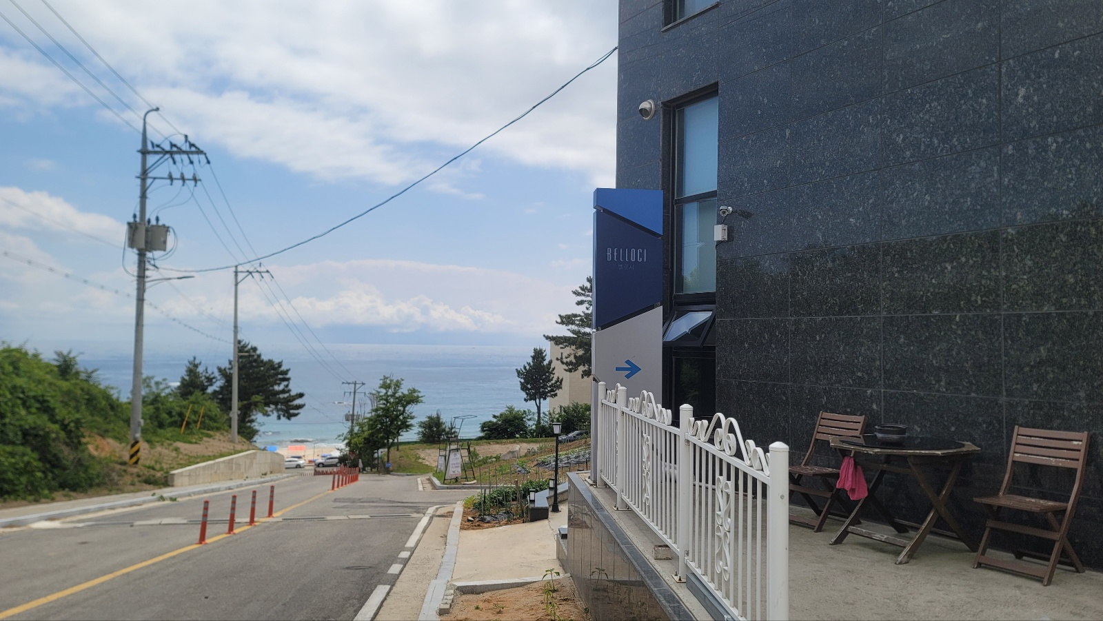 벨로시 아야진 풀빌라에 도착할쯤 아야진 해수욕장이 보였어요. 바로 바다가 보이는 전경이어서 숙소에 들어가서 배란다 창에서 보았을때 한눈에 바다 풍경이 들어왔습니다. 저는 101호에서 숙소를 묵었는데 바다뷰가 잘보이고 바로 입구라서 들어가기 편했습니다.