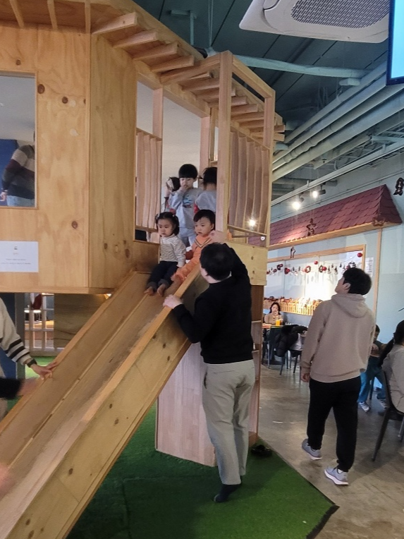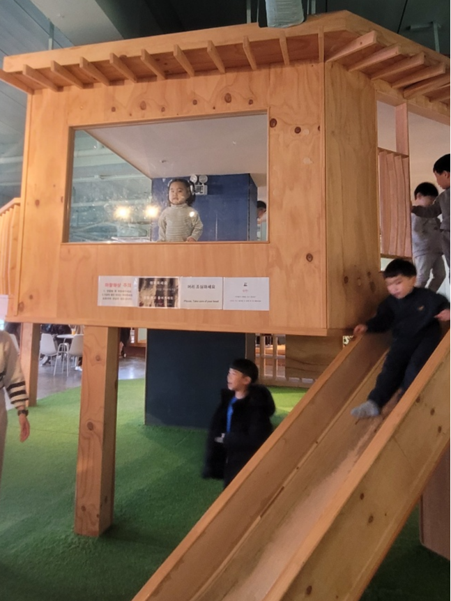 2층 카페 중간에는 아이들이 신나게 뛰어놀 수 있는 계단으로 오르는 오두막이 있었습니다. 이미 영유아의 어린아이들이 신나게 미끄럼틀을 타고 있었어요. 나무로 만들어져서 튼튼하고 안전하게 설치되어 있어서 아이가 맨발로 뛰어놀아도 괜찮았습니다. 우리 아이는 계속 계단을 올랐다가 위에서 여기저기 구경하다 미끄럼틀을 타고 신나게 내려왔어요. 한참을 계속 놀게 되는 것 같습니다. 카페에서 부모들은 아이를 보면서 차 한잔의 여유를 느낄 수 있고 아이는 키즈카페 온 거 같은 효과를 주는 곳이었어요. 그리고 2층 엘리베이터를 타고 올라가면 바로 옆에 아이들이 자유롭게 책을 읽을 수 있는 공간이 있었습니다. 책이 흥미진진한 내용이 있어서 아이가 계속 책을 읽어달라고 했어요. 여기 있다 보니 시간 가는 줄 모르고 아이가 잘 놀았어요. 신나게 놀고 뿌듯하게 집으로 올 수 있었어요.