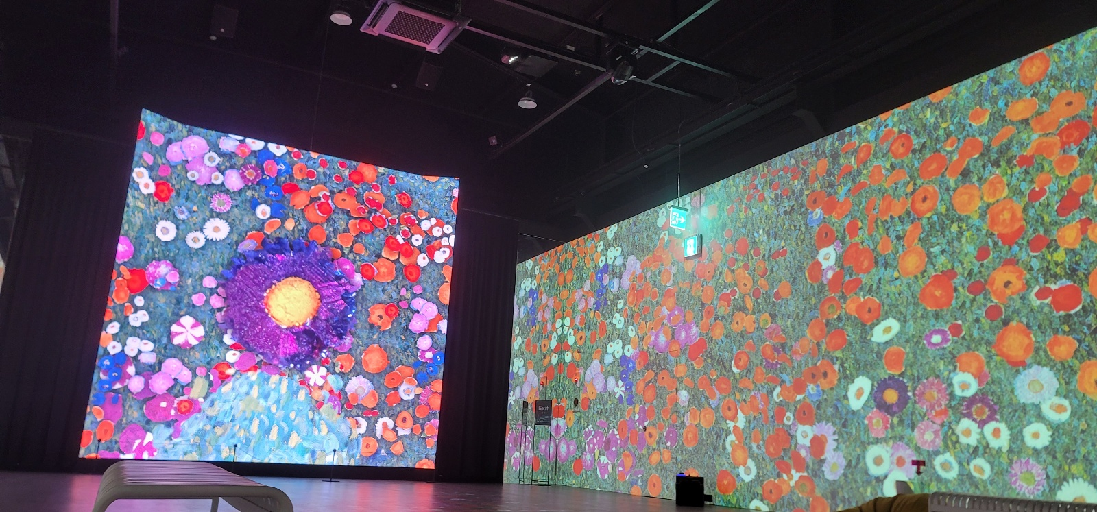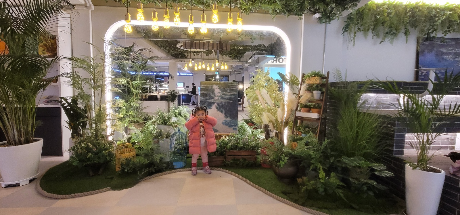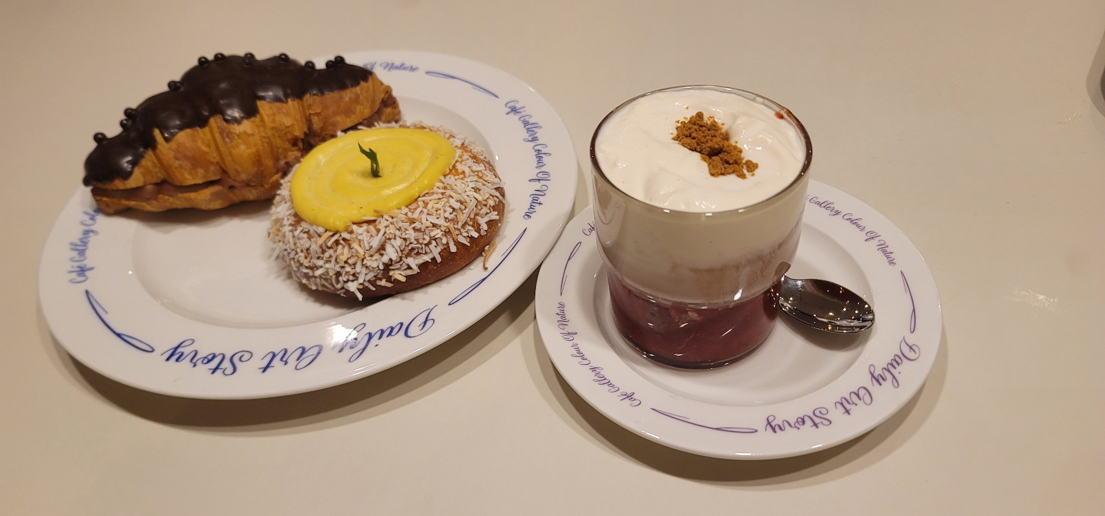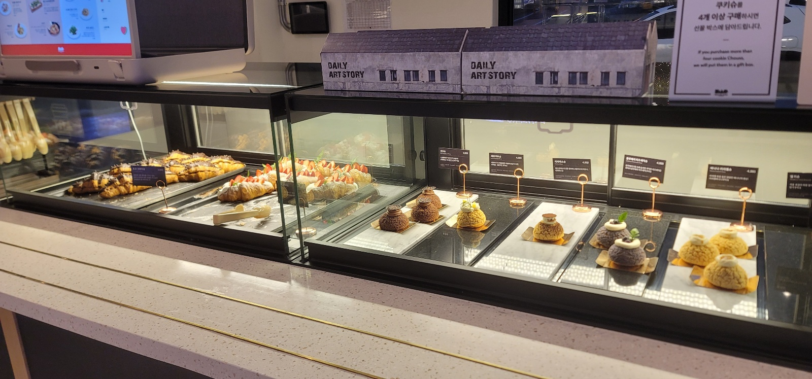 추가로 아이와 함께 용인에 갈만한 카페를 추천해드릴까 합니다. 데일리아트스토리 용인점입니다. 차로 30분정도 있는 거리였지만 거대한 스크린을 통해 명화를 감상하며 5성급 호텔 셰프와 공동 개발한 베이커리&디저트 그리고 브런치 등을 맛볼 수 있는 카페 공간으로 두 개의 층과 루프탑으로 구성되어있습니다. 월,화,수,목,일요일은 오전 10시부터 저녁 9시까지 운영하고 금,토요일은 오전 10시부터 저녁 10시까지 운영하고 있습니다. 음료&빵도 있고 식사종류도 있어요. 파스타나 브런치도 있습니다. 입구에 바로 들어서자마자 사진스팟이 있더라구요. 아이가 스스로 사진 찍어달라고 하네요. 자연과 아트를 감상할 수 있는 1층이였어요.