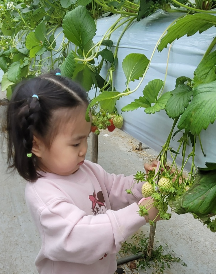 입구로 들어서자 이미 앞타임에 딸기를 체험하고 딸기 아이스크림, 딸기초쿄만들기 체험하는 사람들이 테이블에 앉아 있었어요. 비닐하우스 실내라서 따뜻해서 외투 걸어두는 곳에 걸어두고 예약자 성명을 주문 데스크에 말씀드리니 곧 우리 아이차례가 되었네요. 딸기를 딸 가위와 투명용기를 주었어요. 1인당 1개씩 해서 3통을 담을 수 있었어요. 아이가 들어서니 딸기들을 직접 따겠다고 집중을 하네요. 한줄에 들어가면 중간에 줄옮기기가 어려워서 바닥으로 넘어갔네요. 처음에는 사람들이 많이 따서 그런지 중간쯤 가니 빨갛고 큰 딸기들이 주렁주렁 열려있더라구요. 나중에는 아이가 자기가 골라서 직접따고 칭찬해주니 즐거워했어요.