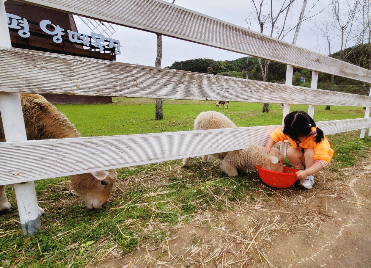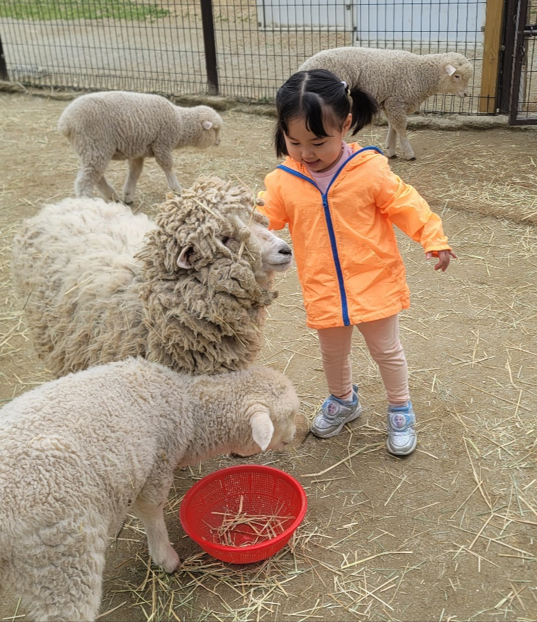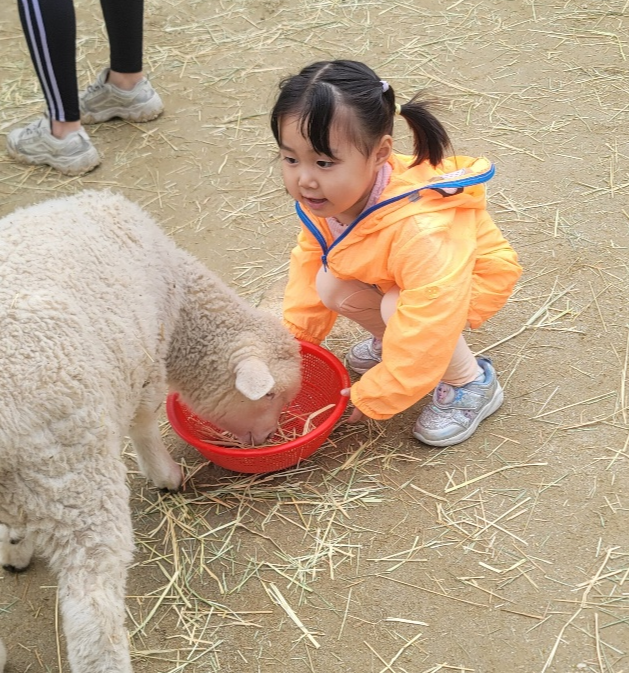 양 우리 안에 있는 곳도 있고 울타리가 있어서 자유롭게 양들을 만지면서 소쿠리 안에 건초를 넣어서 먹이를 주는 곳도 있었어요. 우리 아이가 들어가 보고 싶어 해서 직접 양을 가까이에서 볼 수 있었어요. 아이가 생각보다 무서워하지 않고 양의 부드러운 털을 만져보고 먹이도 적극적으로 주었어요. 한참을 골고루 이양 줬다가 저양 줬다가 신나게 먹이를 주고 다른 곳도 구경 가봤어요~