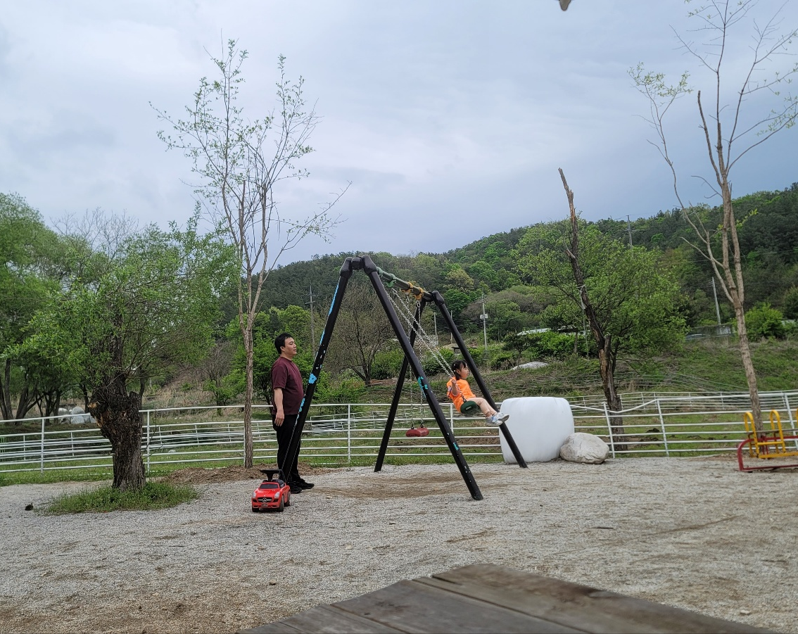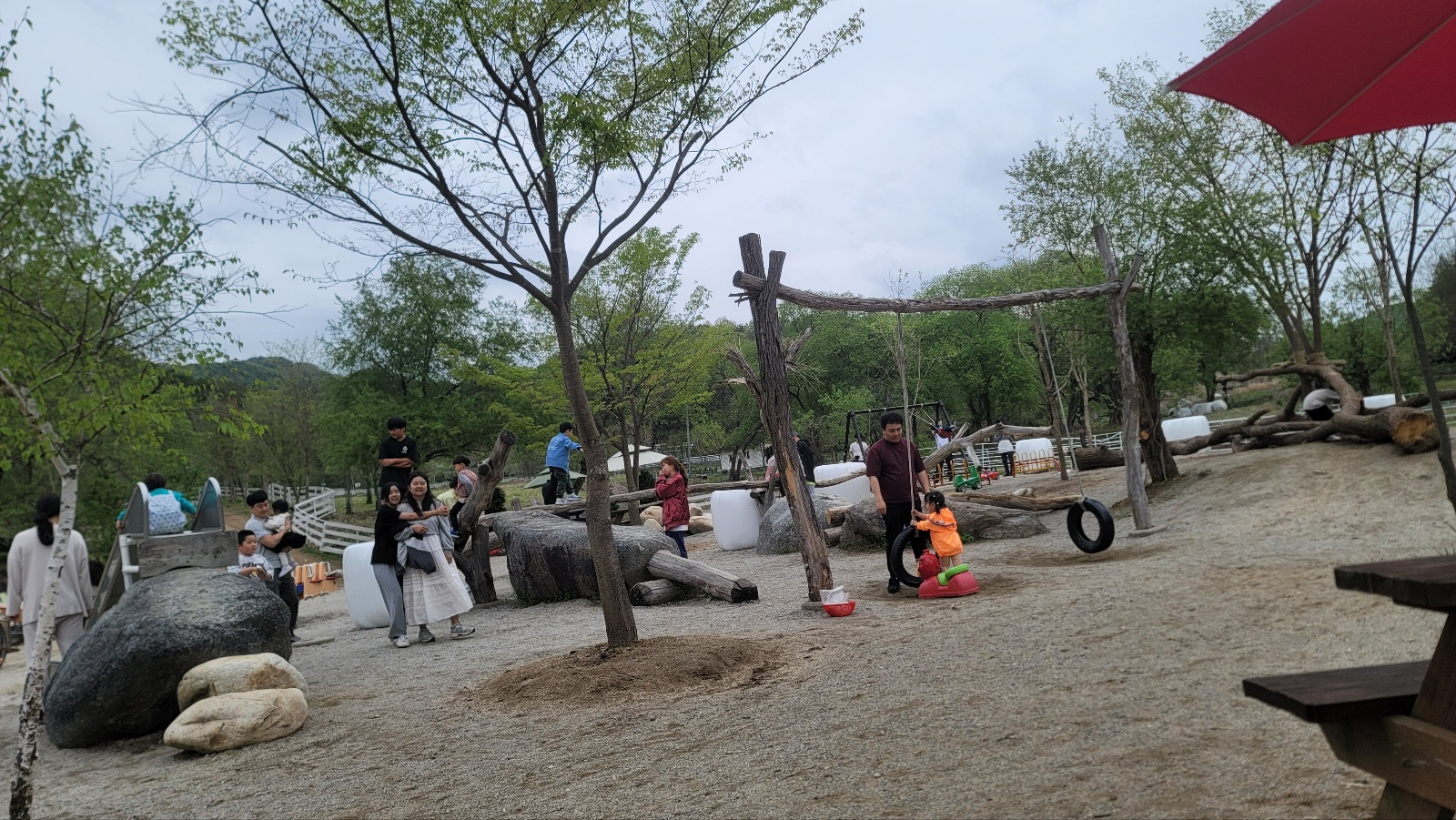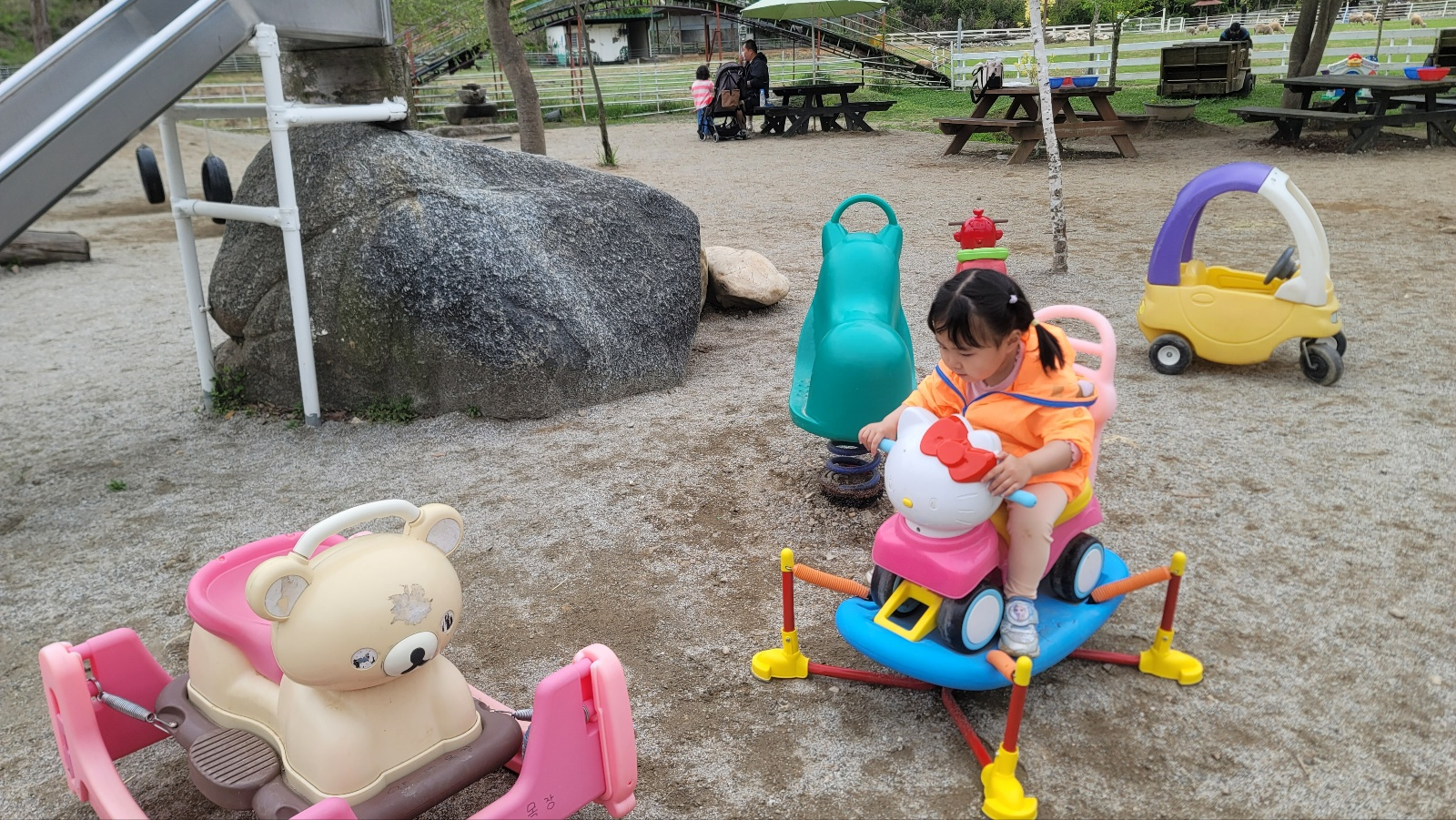 아이들이 모래놀이를 할 수 있는 공간이 있었습니다. 모래놀이 장난감이 따로 필요 없었어요. 약간 지저분하긴 해도 어차피 모래 범벅이 되기 때문에 제대로 놀고 한 번에 털어주었어요. 놀이터는 자연친화적으로 바위와 나무로 구성되어 있어서 우리 아이는 신나게 나무 위로 올라가서 놀았어요. 그리고 군데군데 타는 장난감에도 관심을 보이더라고요. 수레탈 수 있도록 되어있어 한번 태워보았어요. 한참을 놀이터에서 아빠 손을 잡고 나무 위에도 올라가고 그네도 타고 아빠와 함께 신나게 놀았습니다.