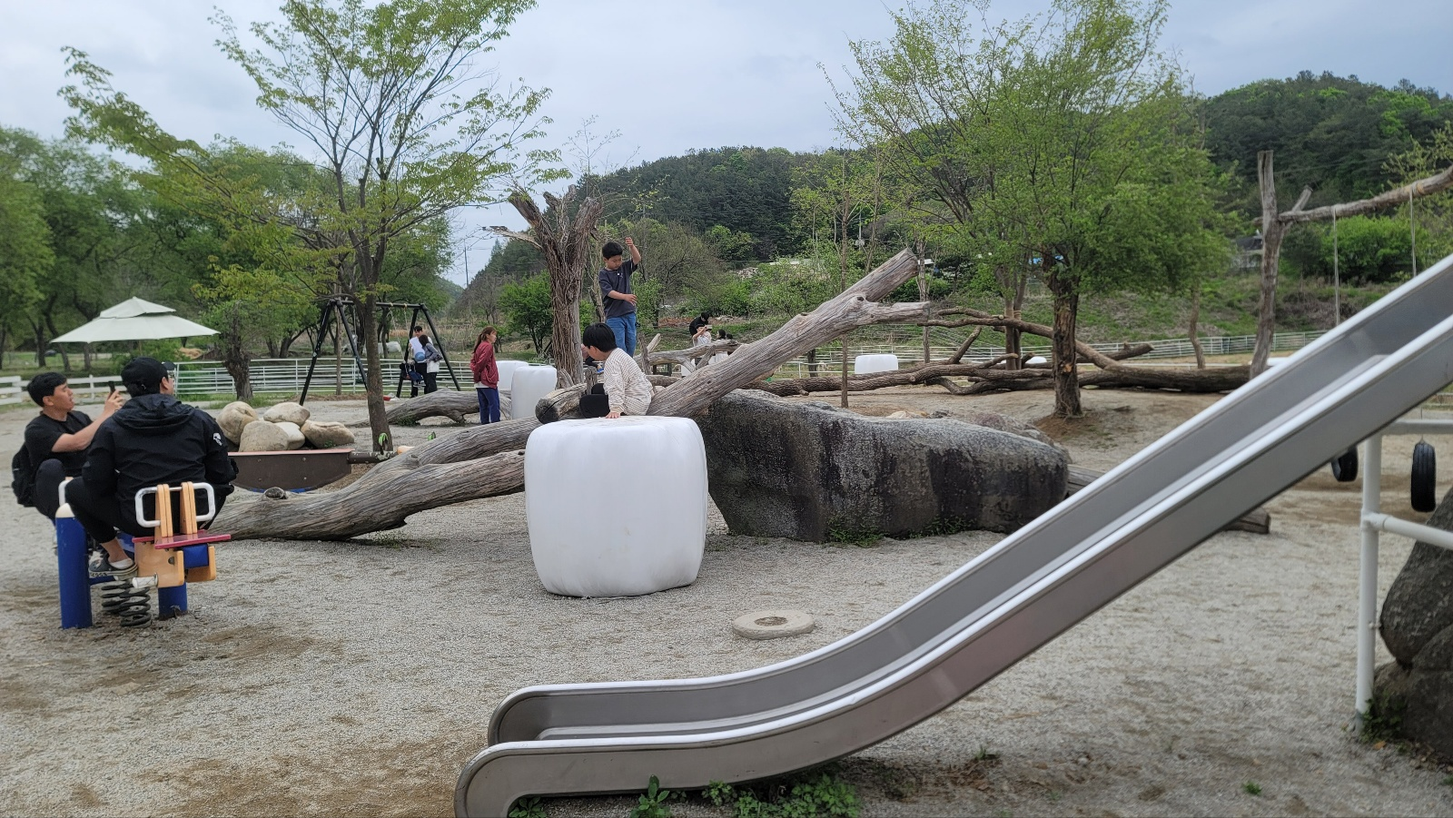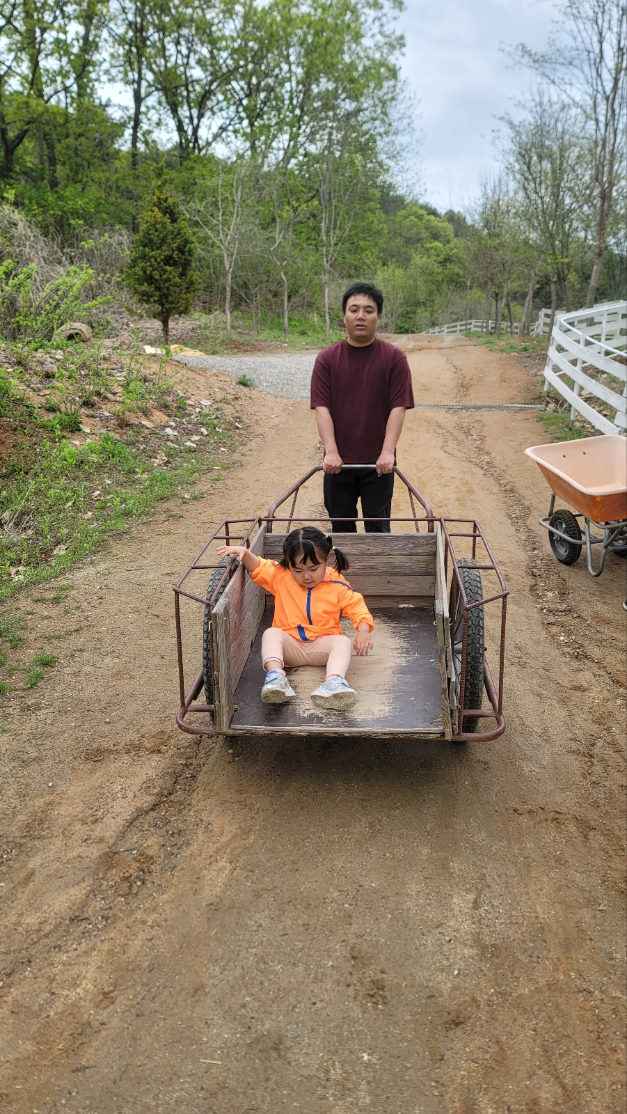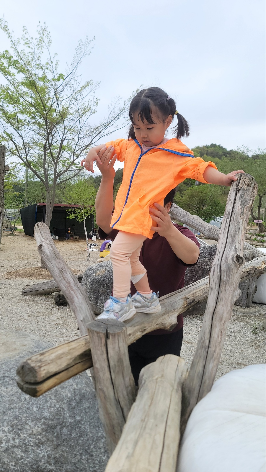 아이들이 모래놀이를 할 수 있는 공간이 있었습니다. 모래놀이 장난감이 따로 필요 없었어요. 약간 지저분하긴 해도 어차피 모래 범벅이 되기 때문에 제대로 놀고 한 번에 털어주었어요. 놀이터는 자연친화적으로 바위와 나무로 구성되어 있어서 우리 아이는 신나게 나무 위로 올라가서 놀았어요. 그리고 군데군데 타는 장난감에도 관심을 보이더라고요. 수레탈 수 있도록 되어있어 한번 태워보았어요. 한참을 놀이터에서 아빠 손을 잡고 나무 위에도 올라가고 그네도 타고 아빠와 함께 신나게 놀았습니다.