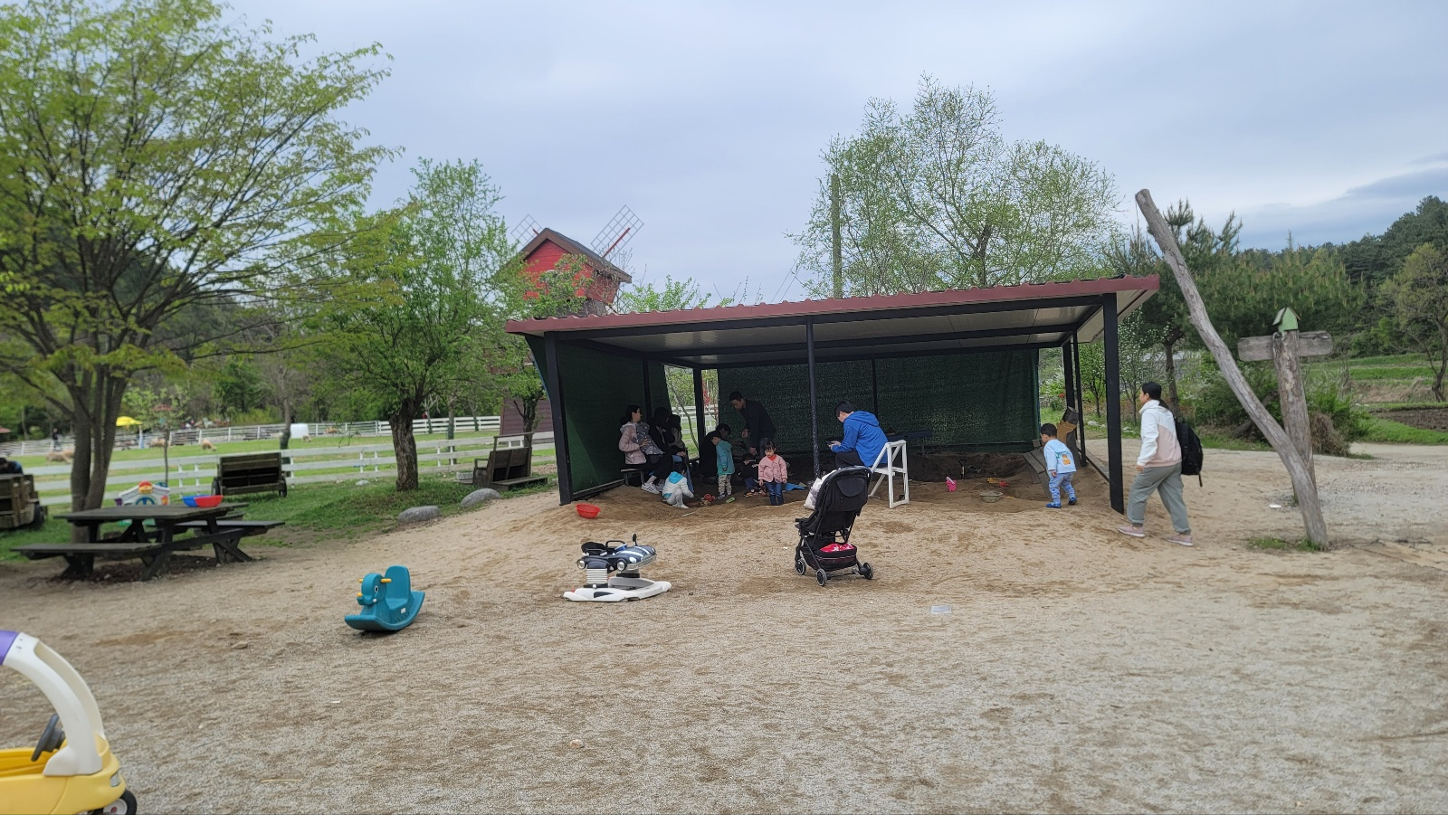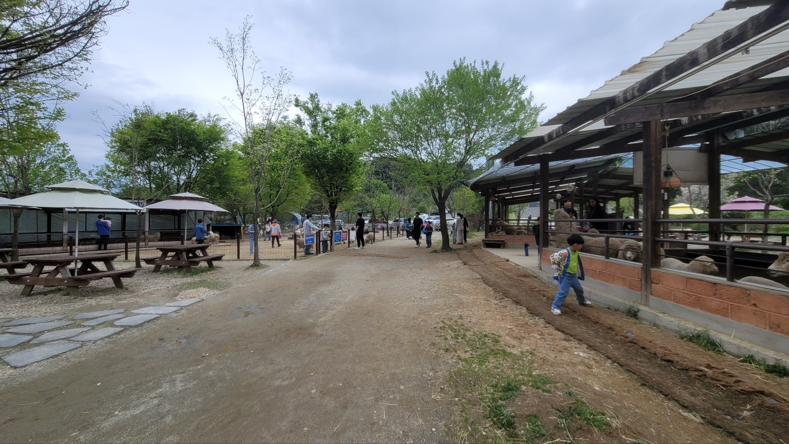 양만 있는 것이 아니라 조금 올라가니 타조 우리가 있었어요. 우리 아이가 신기해하더라고요. 타조 알도 있고 검은색은 수컷, 회색은 암컷 타조였어요. 가까이가면 쪼일 수 있다고 하니 너무 가까이 가지않는 것을 권장합니다. 그 옆에는 거위 우리가 있었어요. 거위가 바로 앞까지와서 꽥꽥꽥하니 우리아이가 건초를 주려고 하더라구요. 오리는 먹으려다가 안 먹더라고요. 가까이에서 동물들을 볼 수 있어서 좋았습니다. 여기 근처에 화장실이 있으므로 아이들 같은 경우 미리 들렀다 가시는 것을 추천해요. 우리 아이는 저 멀리까지 갔다가 화장실 찾으러 여기로 다시 돌아와야 했었습니다.