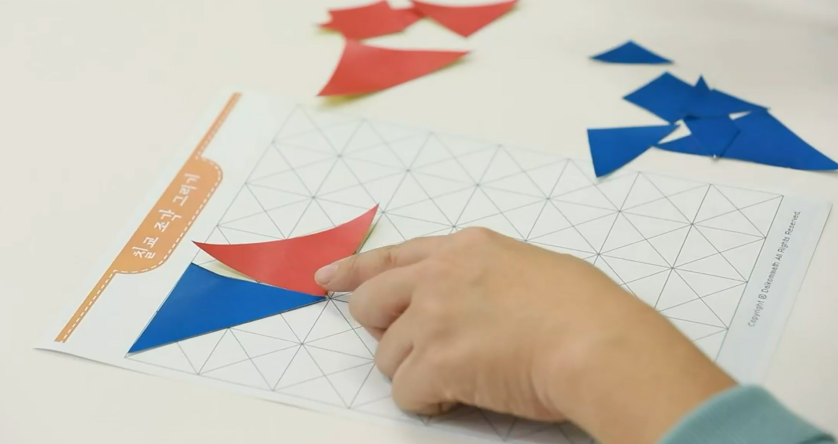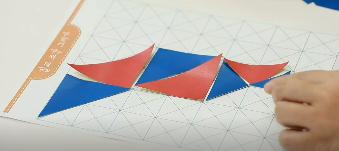 일곱 개로 이루어진 칠교로 단순한 형태인데 하나는 선으로 접고 가위로 잘라봅니다. 다 잘나 보고 나니깐 사각형이였는데 다른 도형들이 있네요. 전에 정사각형을 생각하면서 만들어봅니다. 완성해 줍니다. 기본으로 해서 재미있는 형태 만들기를 합니다. 다른 색깔로 칠교를 2개 세트를 만들어줍니다. 같은 변끼리 연결할 수 있습니다. 다른 색깔로 길이가 같은 변끼리 연결해 줍니다. 엄마와 아이가 서로 누가 누가 꼬리잇기 잘하는지 해보아도 좋습니다. 다음으로는 삼각형은 삼각형끼리 사각형은 사각형끼리 모아줍니다. 꼭짓점이 3개, 변이 3개로 삼각형이고 꼭지점이 4개, 변이 4개로 사각형이네 하면서 만들어봅니다. 주어진 도형으로 여러 가지 도형을 만들어봅니다. 다른 형태의 삼각형을 다양하게 만들 수 있습니다.