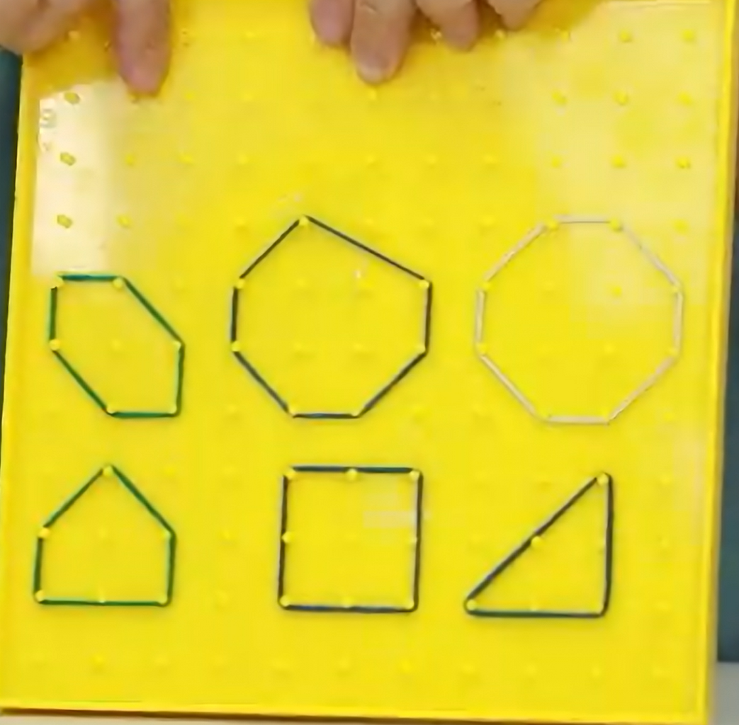 끈으로 세 개를 연결하니 삼각형이었는데 하나로 더 연결하니 사각형이 되었어요. 삼각형과 사각형의 차이를 알게 됩니다. 오각형은? 몇 개일까요 5개점으로 육각형, 칠각형, 팔각형까지 만들어봅니다. 어떻게 변하는지 알 수 있나요? 점점 동그라미가 되었어요. 점점 20 각형까지 만들어보면서 점점 원에 가까워지는 모습을 배울 수 있었습니다.