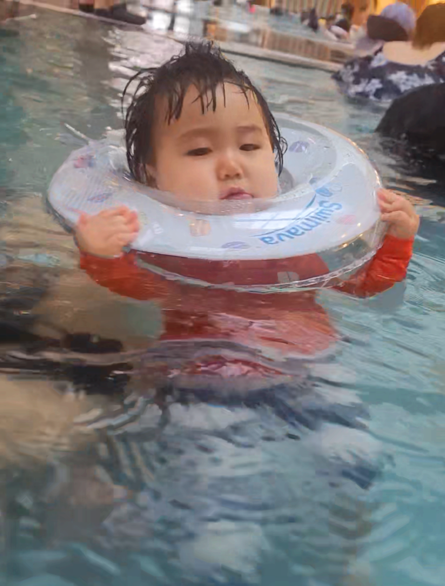 호텔에 도착하자마자 체크인을 하고 객실에 도착해서 케리어 짐을 정리한후, 레시가드를입고 객실에 걸어진 호텔가운을 걸쳐서 수영장으로 유모차에 태워서 아이와 이동했습니다. 은근 수영장으로 가는 거리가 있어서 유모차를 태워서 가는 것이 편했습니다. 안내데스크에 유모차를 두고 입장이 가능했고 락커 사용할지 말지 물어보셔서 락커도 빌렸습니다. 실내 풀장은 오전 7시부터 저녁 9시까지 운영하고 있었으며 실외풀장은 오전 9시부터 저녁 7시까지 운영하였습니다. 썬배드는 무료로 이용할 수 있었는데 미리 자리를 잘 잡아두어야합니다. 튜브는 사용할 수 없고 타월은 무료로 대여함으로 사용하실 수 있습니다. 아이는 호텔에서 제공하는 무료의 구명조끼를 채워주었어요. 수영장은 숙박 1회당 1회 무료 이용이 가능합니다. 실외수영장에서 놀고 실내 수영장으로 이동하자 넓게 펼쳐진 어른용 수영장이 있었어요. 아이도 구명조끼를 채워서 같이 수영을 하면서 재미있게 놀았습니다. 그리고 영유아도 놀 수 있는 얕은 풀장도 있어서 아이가 걸어다니면서 놀 수 있었어요. 그리고 따뜻한 온수풀이나오면서 뽀글뽀글 기포도 나오는 작은 풀장에서도 아이와 놀아주었습니다. 물놀이를 한참하다가 아이가 휴식도 할겸 무료 선배드에서 누워서 쉬었습니다. 여기는 다행히도 수영 모자를 꼭 착용하지않아서 사진찍기에 편했습니다. 그래도 햇빛이 강할 경우 캡모자를 쓰고 수영하였습니다. 물안경을 챙겨가서 어른용 풀장에서 마음껏 수영을 했던 것같아요. 아이를 번갈아 가면서 보면서 우리 부부는 돌아가면서 수영하러 들어갔었어요. 아이키우면서 수영장 한번 제대로 못간 것 같은데 맘껏 수영도 하고 정말 힐링이 되었습니다.