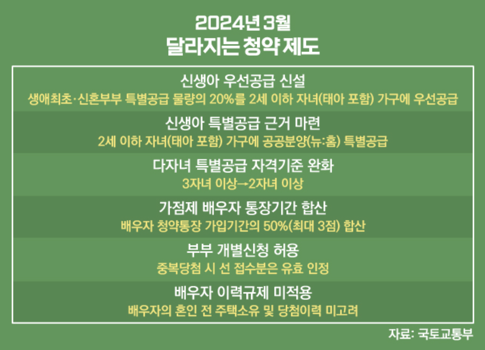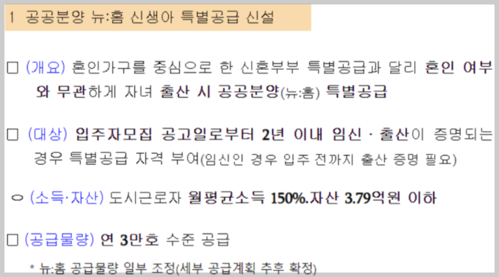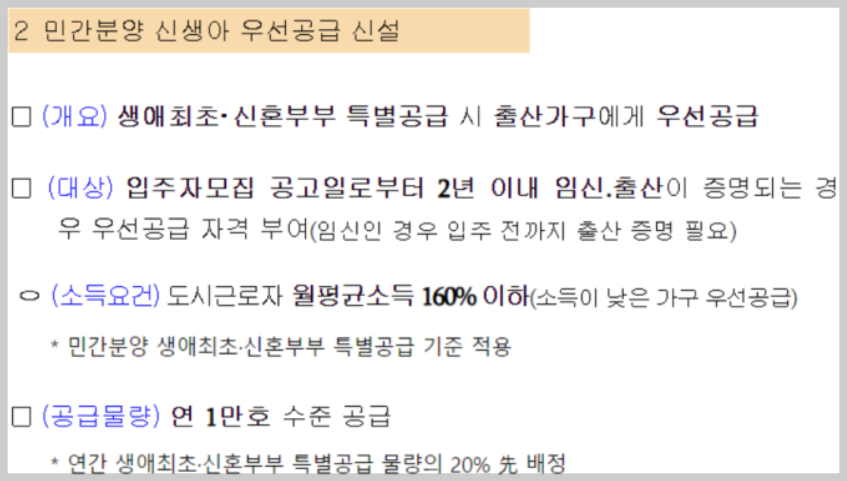 생애 최초 및 신혼부부 특별 공급 시 출산 가구에게 우선 공급하는 제도가 신설되었습니다.