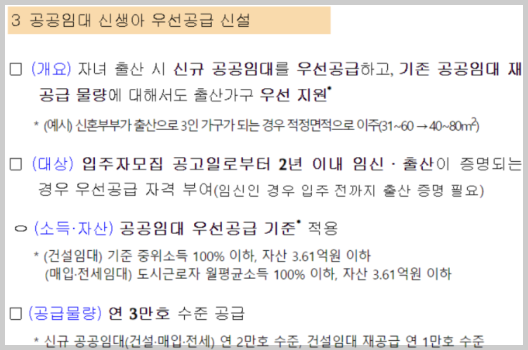 자녀를 출산하는 경우 신규 공공 임대를 우선 공급하고, 기존 공공임대 재공급 물량에 대해 출산 가구 우선 지원하는 제도가 신설되었습니다.