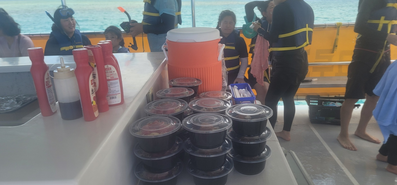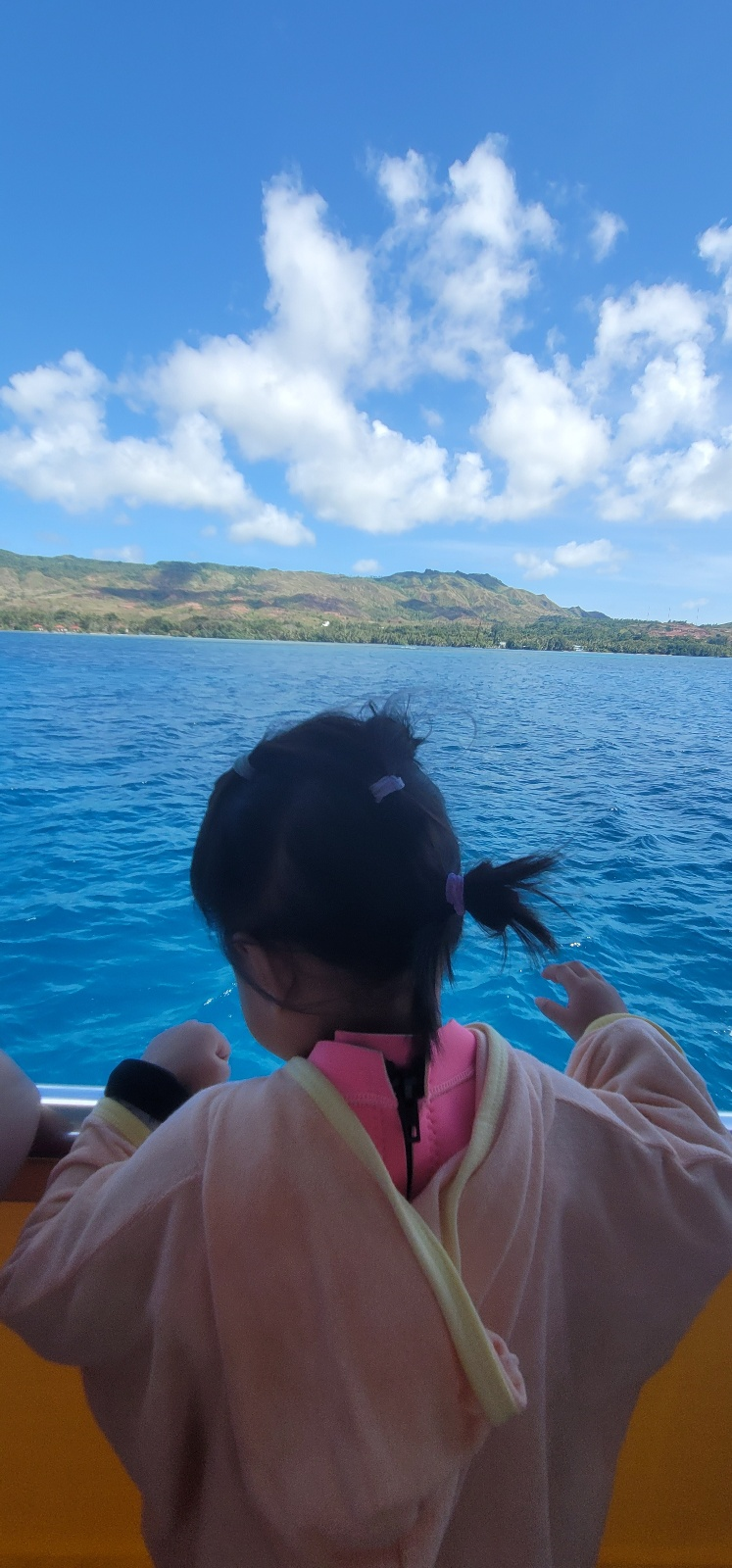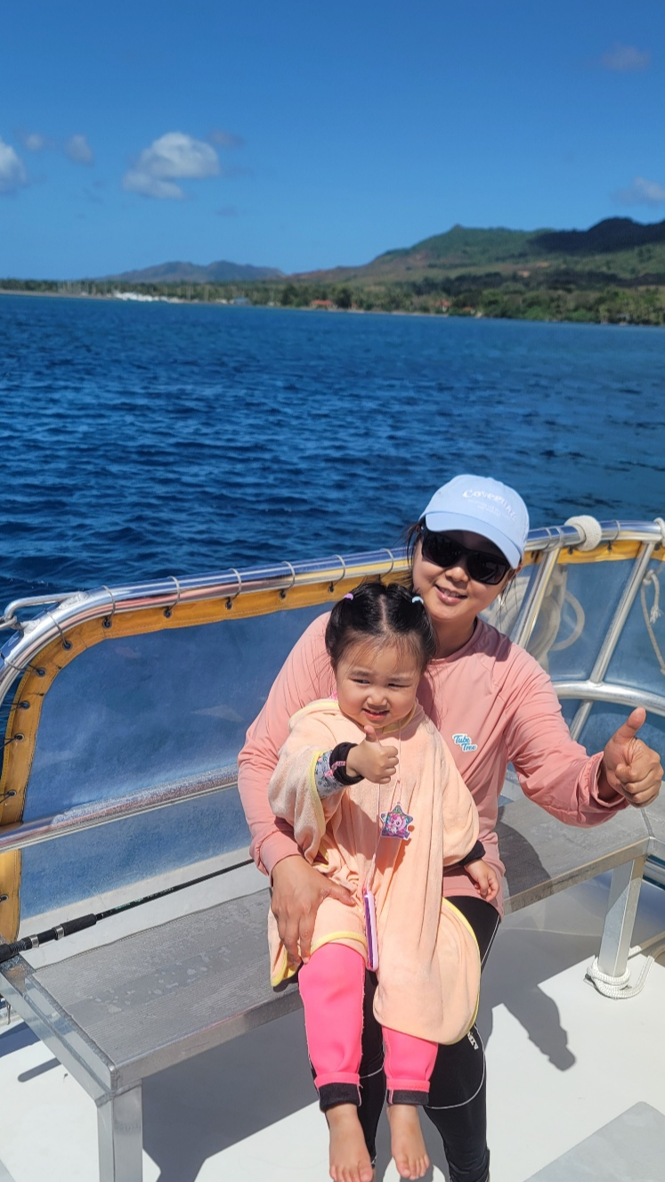 우리 아이의 첫 바다에서의 스노쿨링 도전을 하였습니다. 육안으로도 바로 물고기들이 많이 있었어요. 우리 아이도 들어가 보고 싶다고 해서 얼렁 들어가 보자 했어요. 아이 스노클링 풀페이스용으로 구매했는데 아이가 불편해해서 배안에 투명보트가 있어서 그걸로 바닷속 물고기들을 많이 볼 수 있었어요. 다시 바다로 들어갔는데 선장님이 서진이를 물에서 놀아주셨어요. 유쾌하고 밝은 분위기에서 재미있게 놀았어요^^ 아이가 배위에서 바람이 부는데 아이 걸칠 수건이나 가운이 있으면 좋을 것 같아 챙겨갔는데 잘 챙겨 간 것 같습니다. 나갈 때는 팁을 드렸습니다. 2불 정도로 드렸어요~ 각자 선장님이나 스태프분에게 드리고 배에서 내렸습니다.