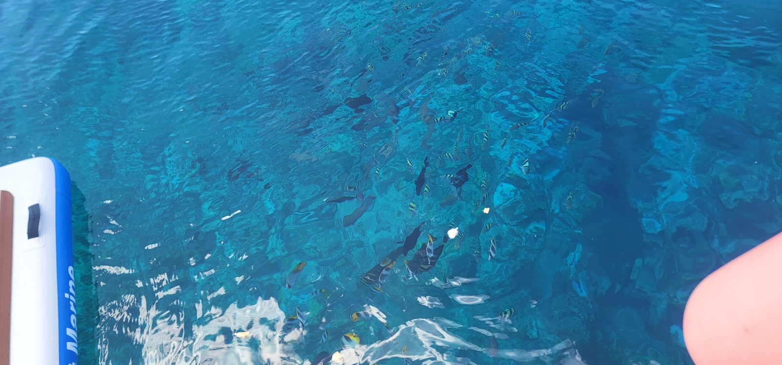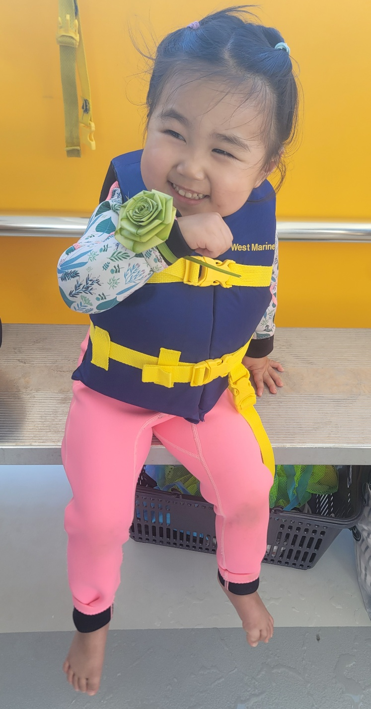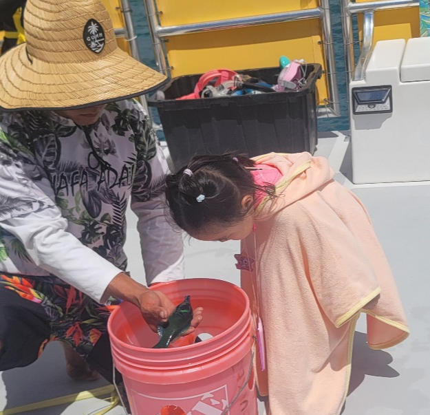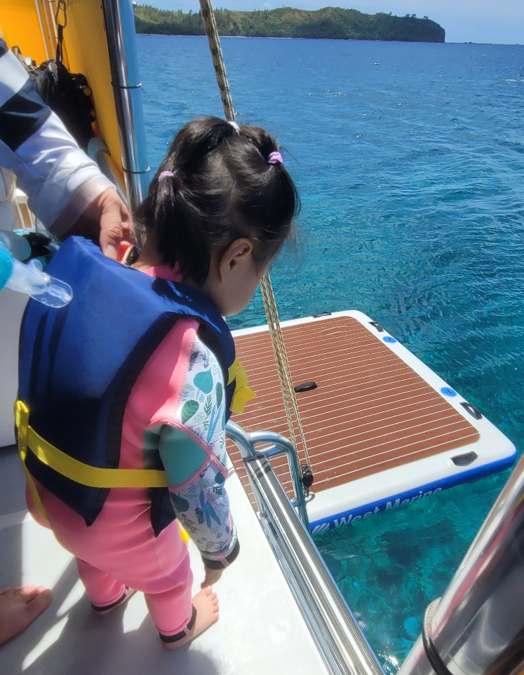 우리 아이의 첫 바다에서의 스노쿨링 도전을 하였습니다. 육안으로도 바로 물고기들이 많이 있었어요. 우리 아이도 들어가 보고 싶다고 해서 얼렁 들어가 보자 했어요. 아이 스노클링 풀페이스용으로 구매했는데 아이가 불편해해서 배안에 투명보트가 있어서 그걸로 바닷속 물고기들을 많이 볼 수 있었어요. 다시 바다로 들어갔는데 선장님이 서진이를 물에서 놀아주셨어요. 유쾌하고 밝은 분위기에서 재미있게 놀았어요^^ 아이가 배위에서 바람이 부는데 아이 걸칠 수건이나 가운이 있으면 좋을 것 같아 챙겨갔는데 잘 챙겨 간 것 같습니다. 나갈 때는 팁을 드렸습니다. 2불 정도로 드렸어요~ 각자 선장님이나 스태프분에게 드리고 배에서 내렸습니다.