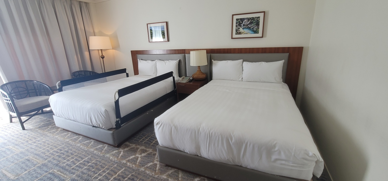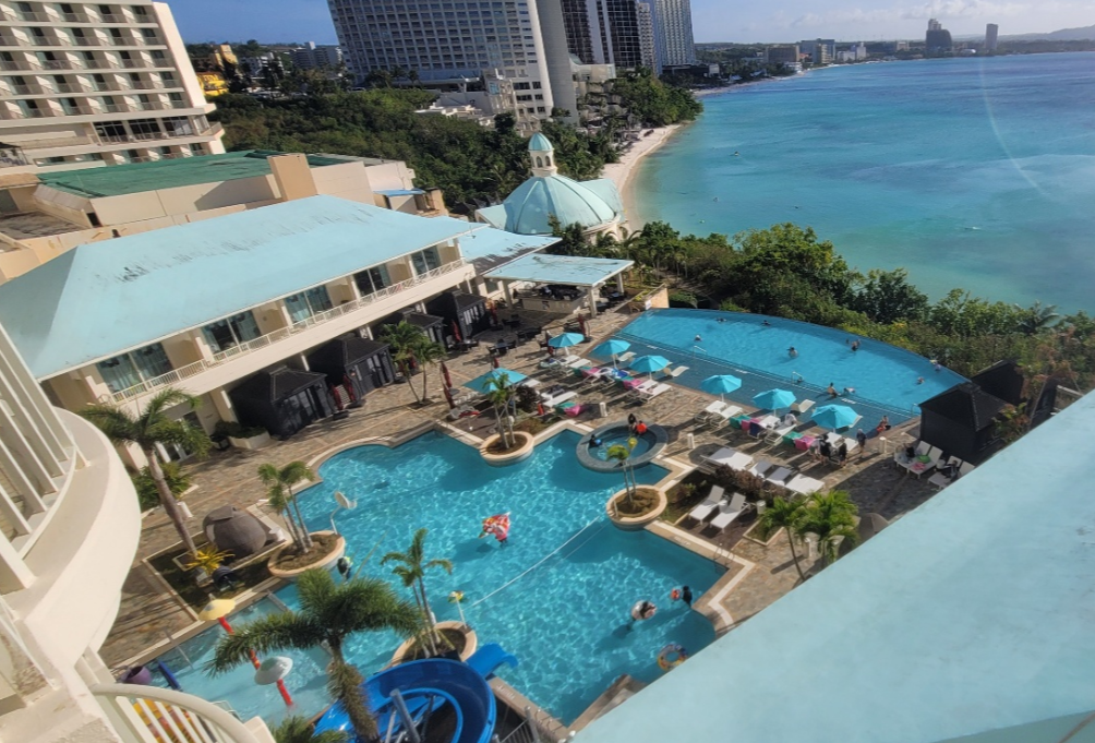 바로 PIC로 이동해서 아이와 저는 로비에서 좀 기다리니 남편은 렌트카를 가지고 왔어요. 바로 근처에 있는 롯데호텔로 이동했어요. 사실 11시에 체크아웃이라서 케리어를 맡겼어야 했는데 PIC 1층 로비 입구에 짐을 맡길 수 있는 벨보이 서비스가 있으므로 이용하시면 좋습니다. 롯데 호텔로 도착해서 숙소로 들어가서 본 발코니 뷰입니다. 수영장은 PIC에 비해 아담하지만 전체적으로 깨끗하고 깔끔한 뷰와 시설이었습니다. 내부 숙소가 너무 깨끗하고 욕실도 분리가 되어있어서 편리했어요. 내부도 깔끔하였어요. PIC는 아무래도 친근하고 편안한 느낌이었다면 롯데 호텔은 깔끔하고 깨끗한 환경이었어요. 수영할 때 아이들 튜브나 구명조끼 등 물놀이할 때 사용하기 좋은 물건들이 많이 있었어요. 있는 물건을 데스크에 말씀드리면 빌릴 수 있었어요.