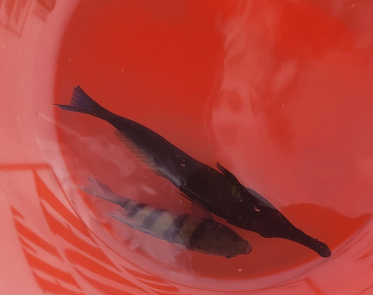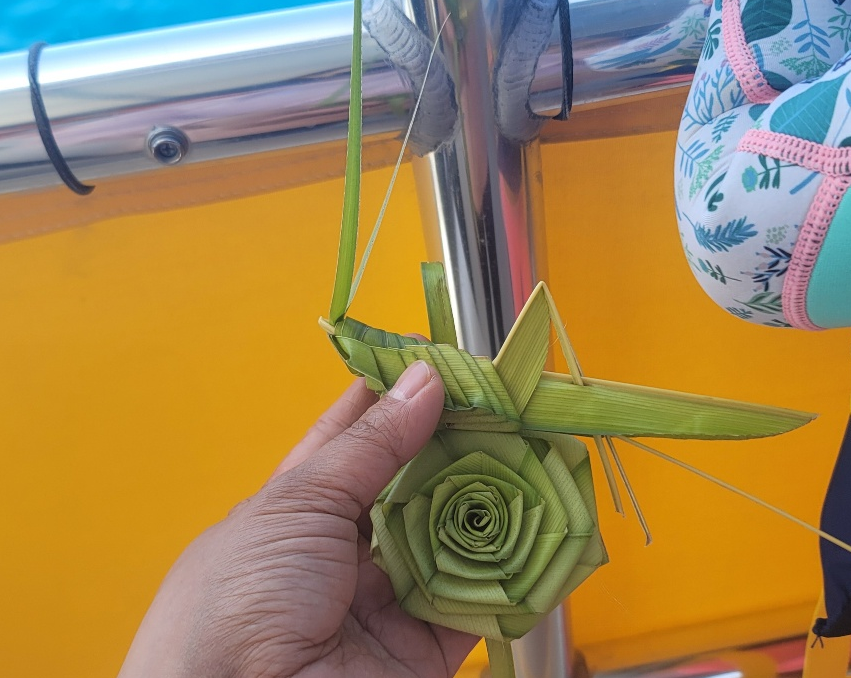 배에서 긴 잎으로 만들어준 메뚜기와 장미를 만들어 주었어요. 장인의 손길이 느껴졌습니다. 우리 아이도 신기한지 재미있게 가지고 놀았습니다. 낚시도 할 수 있게 낚싯대도 주셨는데 우리 아이는 신기한지 물고기통에