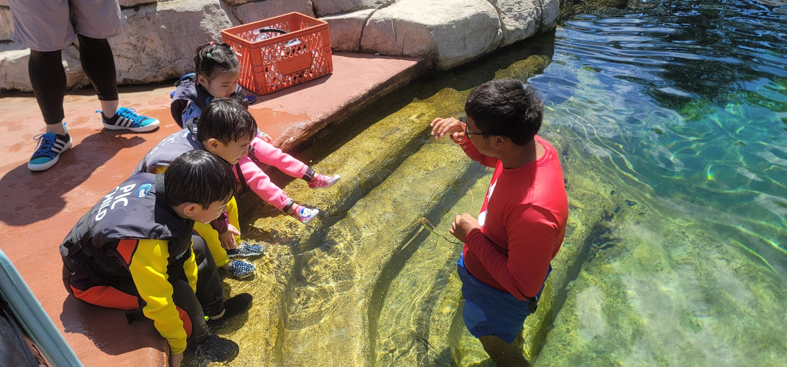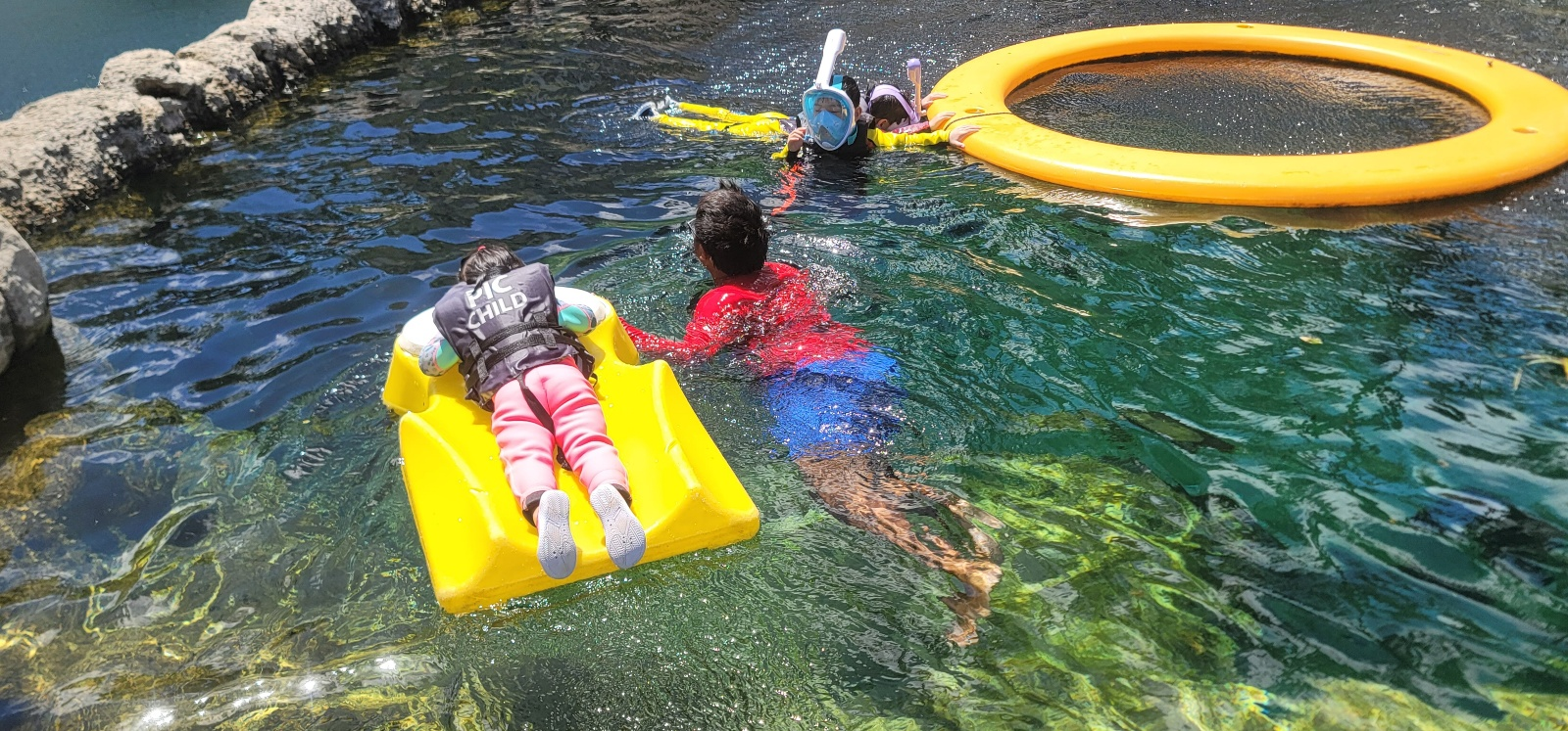 아침이 되니 꼬르륵! 스카이라이트에서 맛있게 밥을 먹고 오늘도 물놀이 스타트했습니다. 서진이를 꺼내오면 다시 물속으로 들어가는 블랙홀 같은 수영장이었습니다. 아이 키랑 잘 맞다 보니까 이 넓은 수영장을 끝까지 수영도 하고 걸어 다니면서 물속에서 나올 생각을 안 했습니다. 아이에게 스노클링을 위해 수영장 내에 위치한 스노클링 예약을 미리 해두었습니다. 아이를 위해 유아용 전면 스노클링마스크를 사갔는데 아이가 아직 어려서 그런지 불편해하더라고요. 그런데 다행히도 그곳에 아래를 볼 수 있는 투명 보트가 있어서 아이가 바닷속을 볼 수 있었어요. 5살 이상부터는 티쳐의 관리하에 아이들과 물놀이도 같이하더라고요. 부모가 같이 있지 않아도 아이들만 참여해서 부모님의 자유시간이 허락되겠더라고요. 우리 아이도 어서 크면 참여할 수 있겠네요. 티쳐가 있으셔서 아이들을 잘 챙겨주셨어요. 서진이는 아예 투명 보트에 붙어서 안떨어질려고 그랬어요. 물고기들이 있으니 신기하였나 보아요.